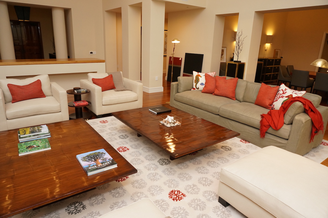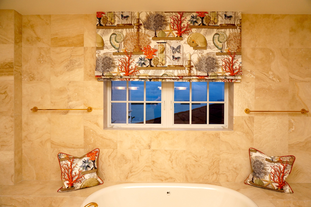Eben genau die Gefühle, die ein Ferienappartment ausdrücken soll. Die farblichen Details ziehen sich durch die gesamte Wohnung, sodass selbst das Korallenmotiv im Wohnzimmerteppich sich mit den Faltrollofstoff im Badezimmer abgesprochen hat. Die Esszimmerstühle Saloni finden Sie in unserem Sortiment. Die Möblierung sowie Teppiche kommen aus dem Hause der JAB Group. Die Stoffe sind größtenteils vom Textilverlag Colefax&Fowler.