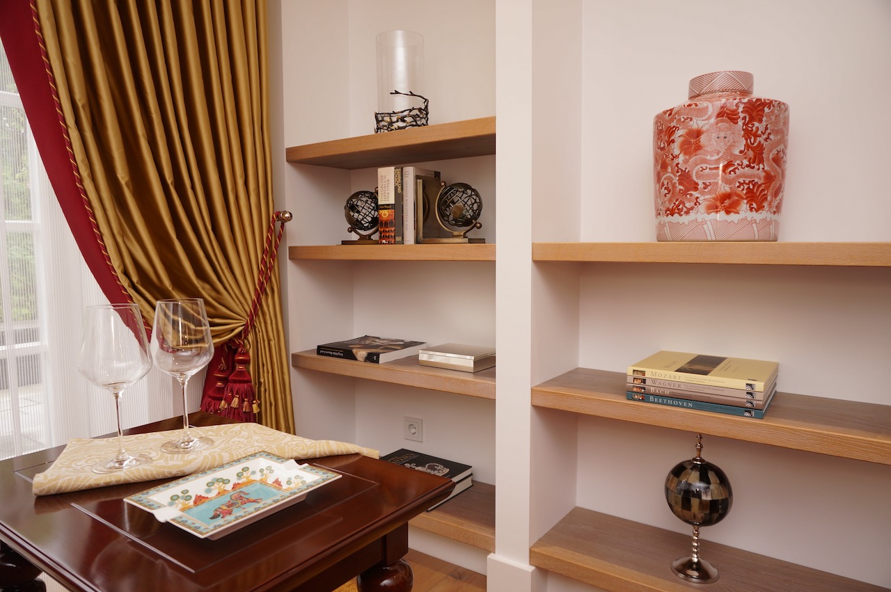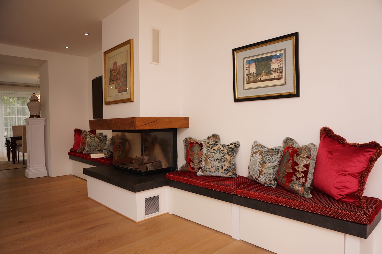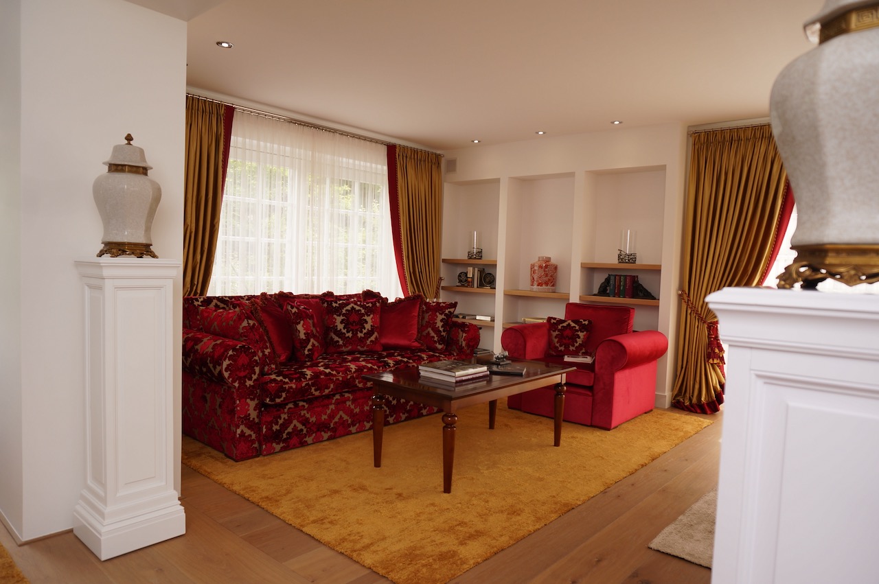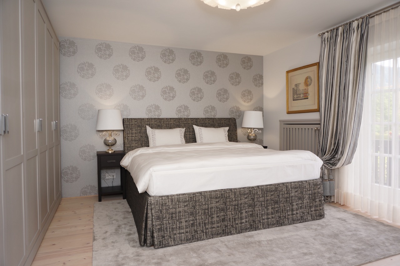 Bei dem Projekt der Stilvilla am See, im Münchner Umland, durfte es für den Kunden gerne ein bisschen mehr sein. Dies hat TAPETENFISCHER INTERIORDESIGN mit einer Kombination aus Brokat- und Ornamentdessins in den Bezugsstoffen sowie der aufwändigen und prächtigen Vorhangdekoration, die in jedem Raum mit viel Detailliebe konzipiert wurde, umgesetzt. Besonders Veloursstoffen des Textilverlags Designers Guild verkörpern Opulenz und laden zum Verweilen ein. Die Schlafzimmer wurden größtenteils mit Stoffen des Textilverlags Colefax&Fowler ausgestattet und dabei gekonnt aufeinander abgestimmt. Details wie Raffhalter des französischen Unternehmens Houlès sowie farblich abgestimmte Bettwäsche der Firma Christian Fischbacher, geben den Räumlichkeiten Charme und Noblesse. Die Holzoberfläche Kirsche wurde auf sämtlichen Holzmöbeln angewendet und von der Firma Form Exklusiv für das Projekt gefertigt.