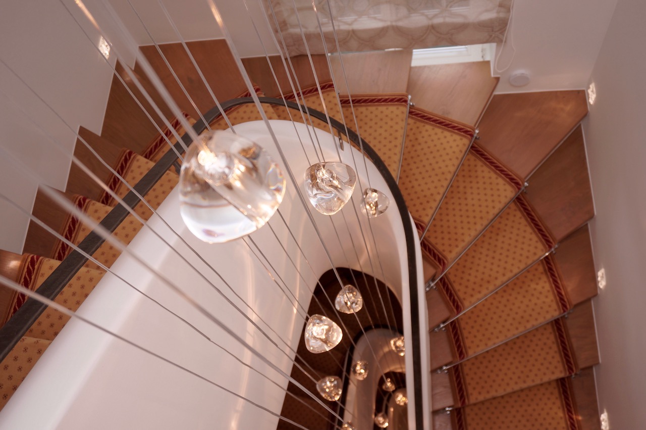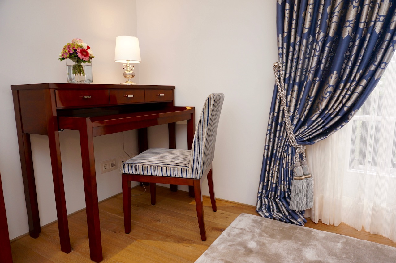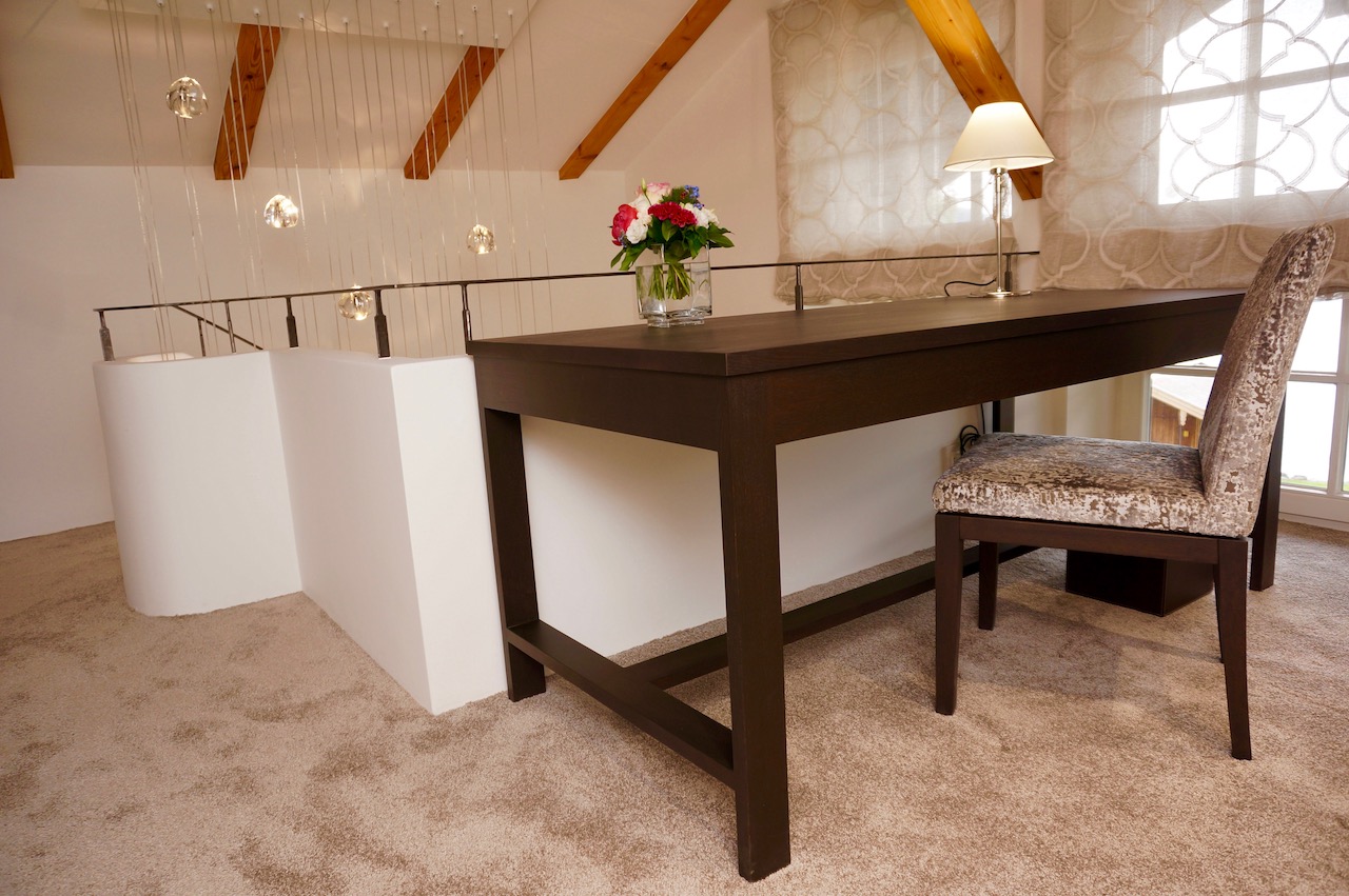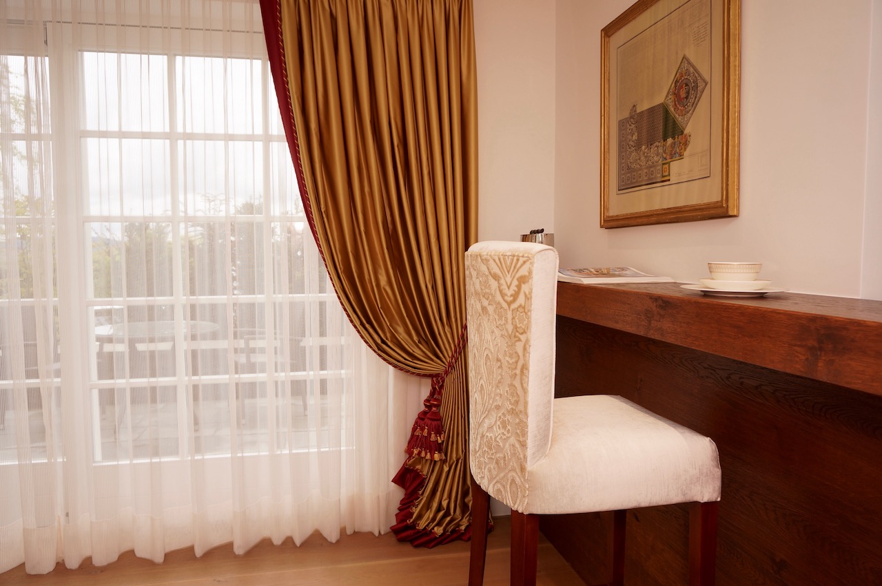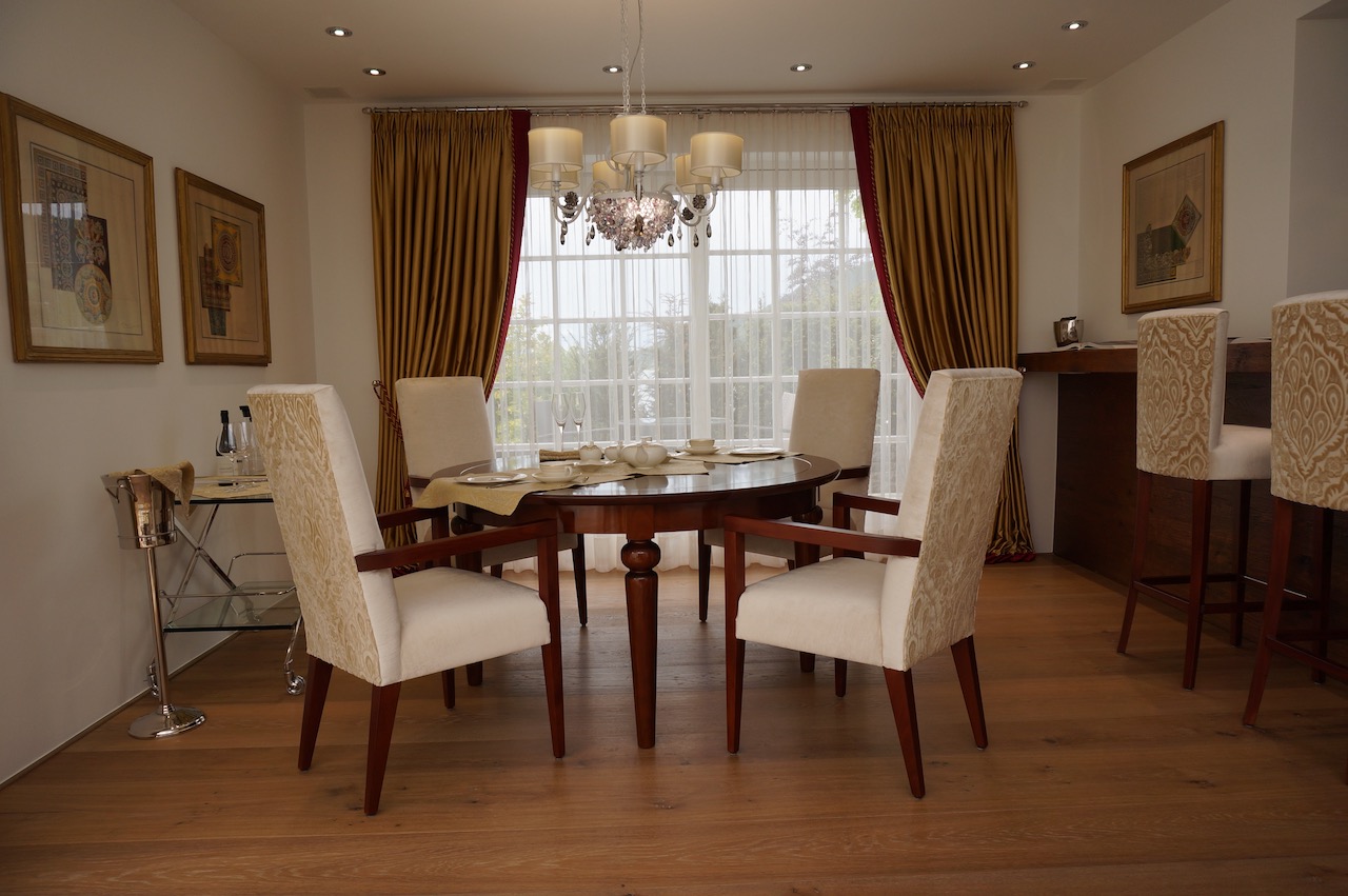 Bei dem Projekt der Stilvilla am See, im Münchner Umland, durfte es für den Kunden gerne ein bisschen mehr sein. Dies hat TAPETENFISCHER INTERIORDESIGN mit einer Kombination aus Brokat- und Ornamentdessins in den Bezugsstoffen sowie der aufwändigen und prächtigen Vorhangdekoration, die in jedem Raum mit viel Detailliebe konzipiert wurde, umgesetzt. Besonders Veloursstoffen des Textilverlags Designers Guild verkörpern Opulenz und laden zum Verweilen ein. Die Schlafzimmer wurden größtenteils mit Stoffen des Textilverlags Colefax&Fowler ausgestattet und dabei gekonnt aufeinander abgestimmt. Details wie Raffhalter des französischen Unternehmens Houlès sowie farblich abgestimmte Bettwäsche der Firma Christian Fischbacher, geben den Räumlichkeiten Charme und Noblesse. Die Holzoberfläche Kirsche wurde auf sämtlichen Holzmöbeln angewendet und von der Firma Form Exklusiv für das Projekt gefertigt.