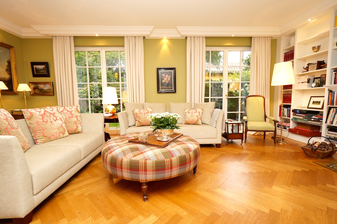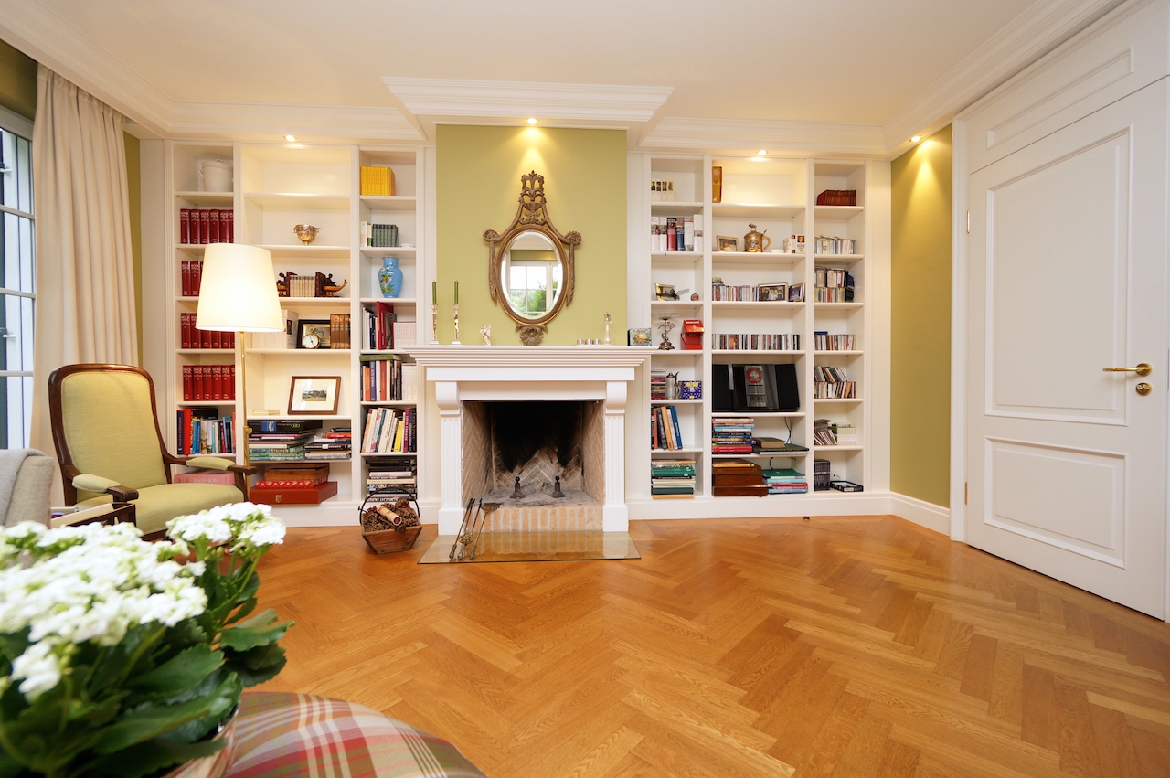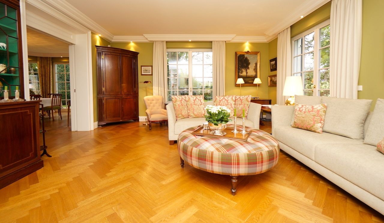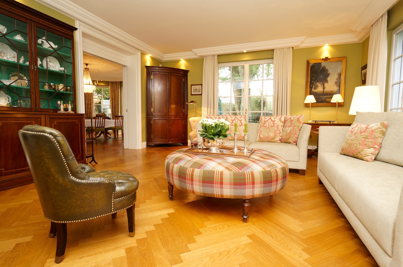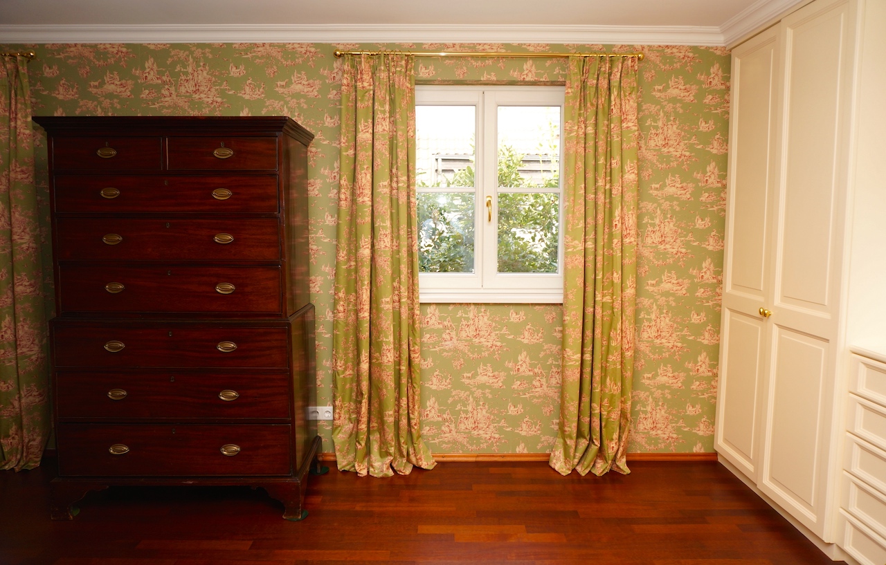 Da der Kunde ein begeisterter Jäger ist, wurden die Farben der Natur aufgegriffen und in Form von Wandfarbe und Tapete, Stoffbezüge sowie Vorhangdekoration umgesetzt. Die klassischen Stuckleisten sowie das wunderbar strahlende Fischgrät Parket geben zusätzlich ein wohnliches Cottage Gefühl. Der offene Kamin lädt zu geselligen Kaminabenden ein.
