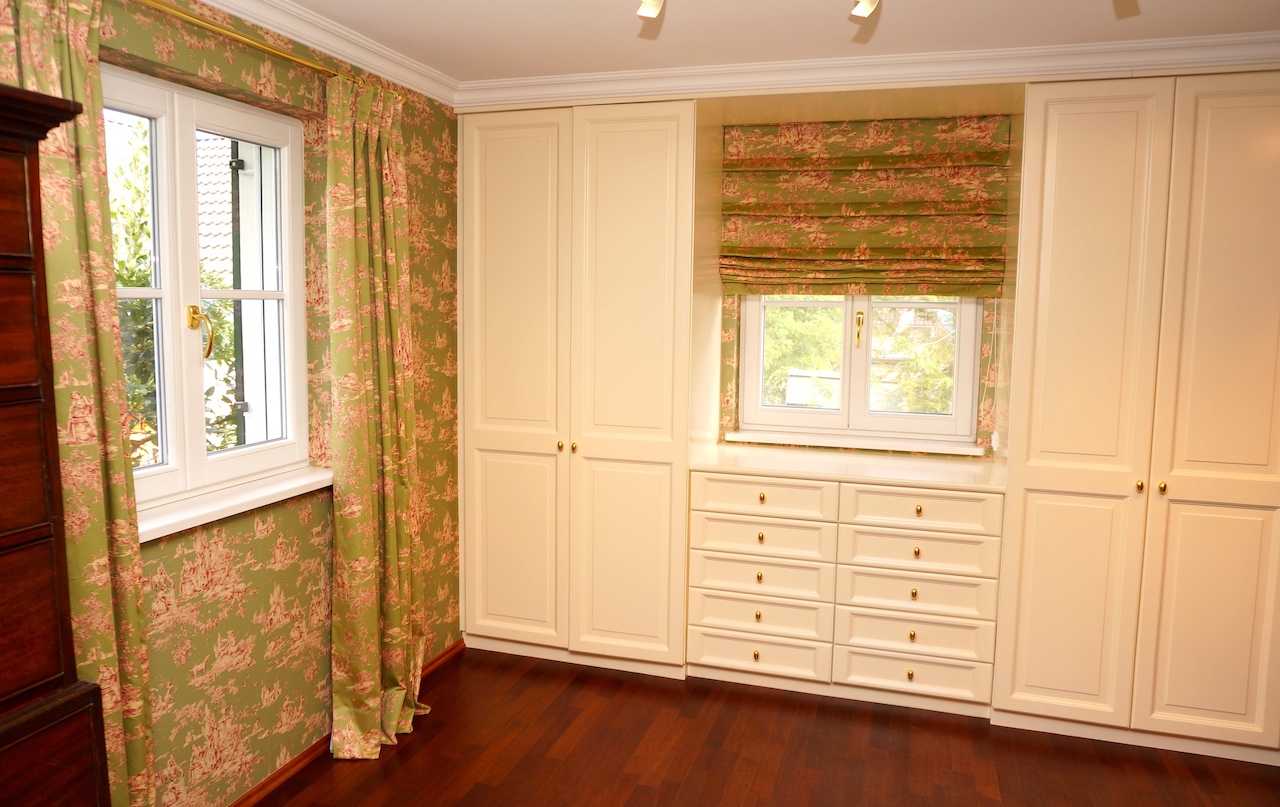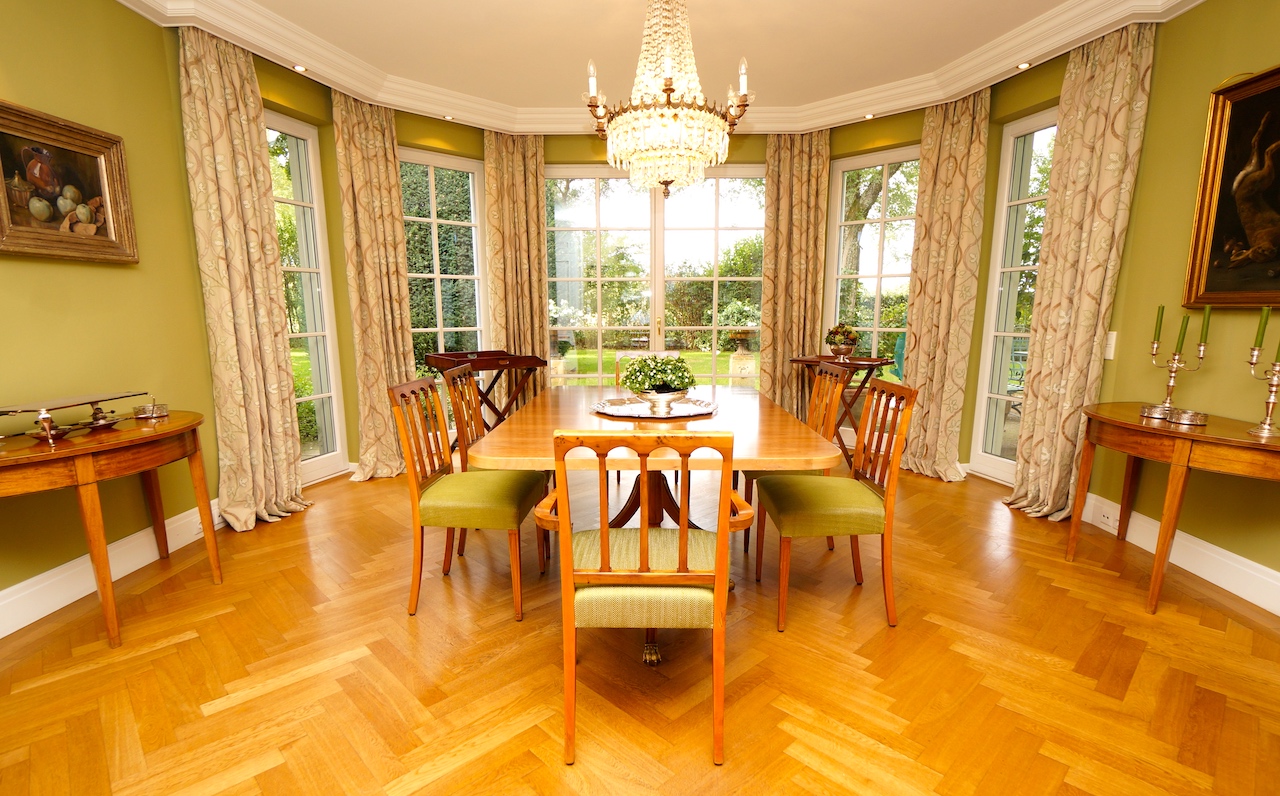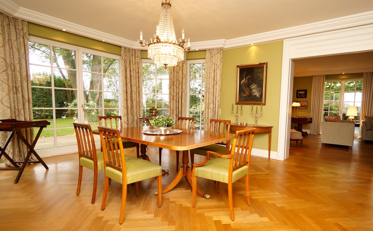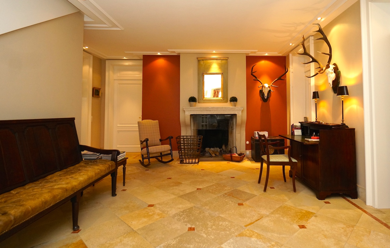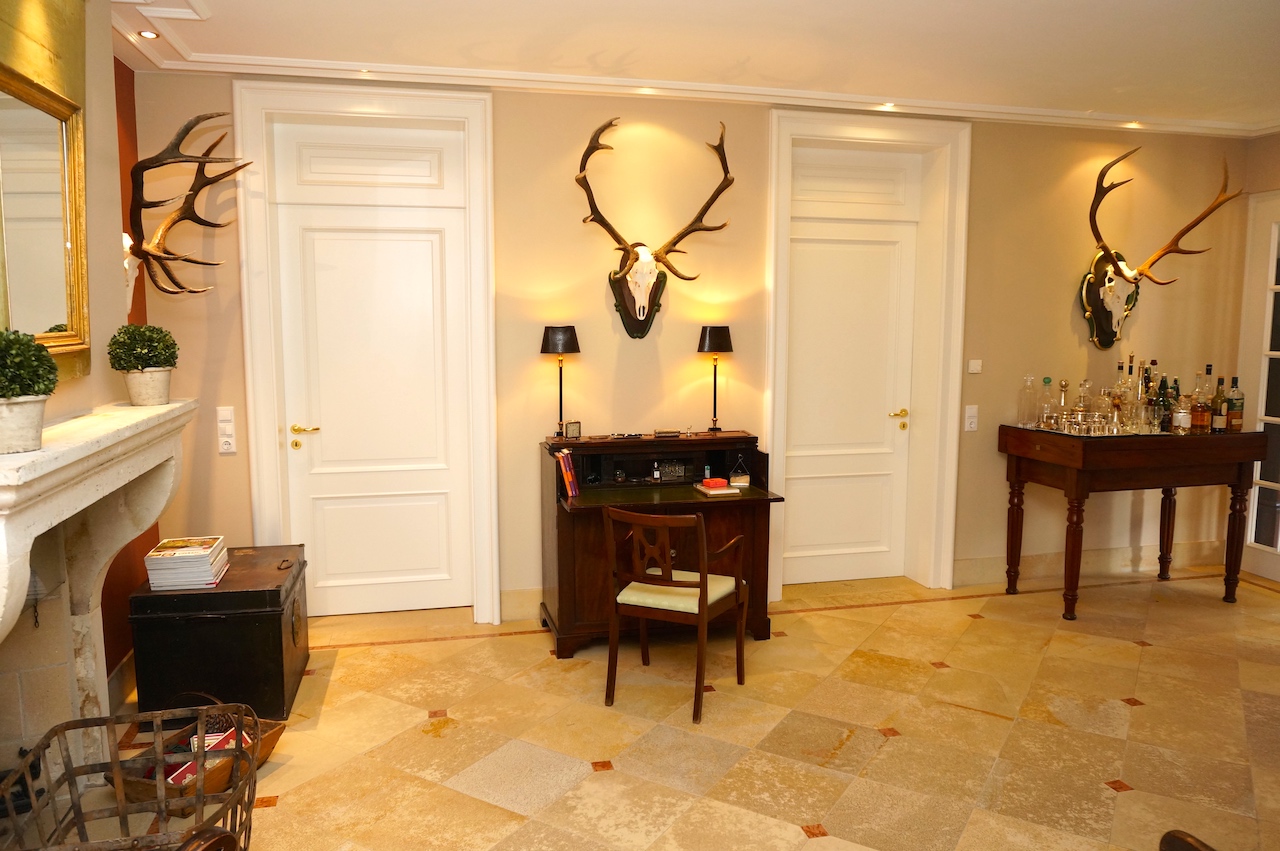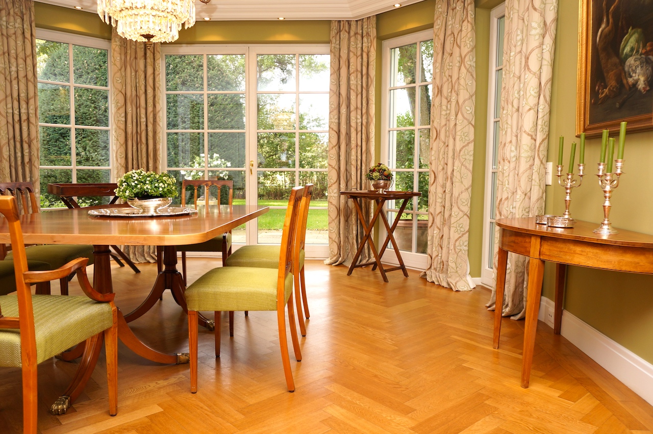 Da der Kunde ein begeisterter Jäger ist, wurden die Farben der Natur aufgegriffen und in Form von Wandfarbe und Tapete, Stoffbezüge sowie Vorhangdekoration umgesetzt. Die klassischen Stuckleisten sowie das wunderbar strahlende Fischgrät Parket geben zusätzlich ein wohnliches Cottage Gefühl. Der offene Kamin lädt zu geselligen Kaminabenden ein.