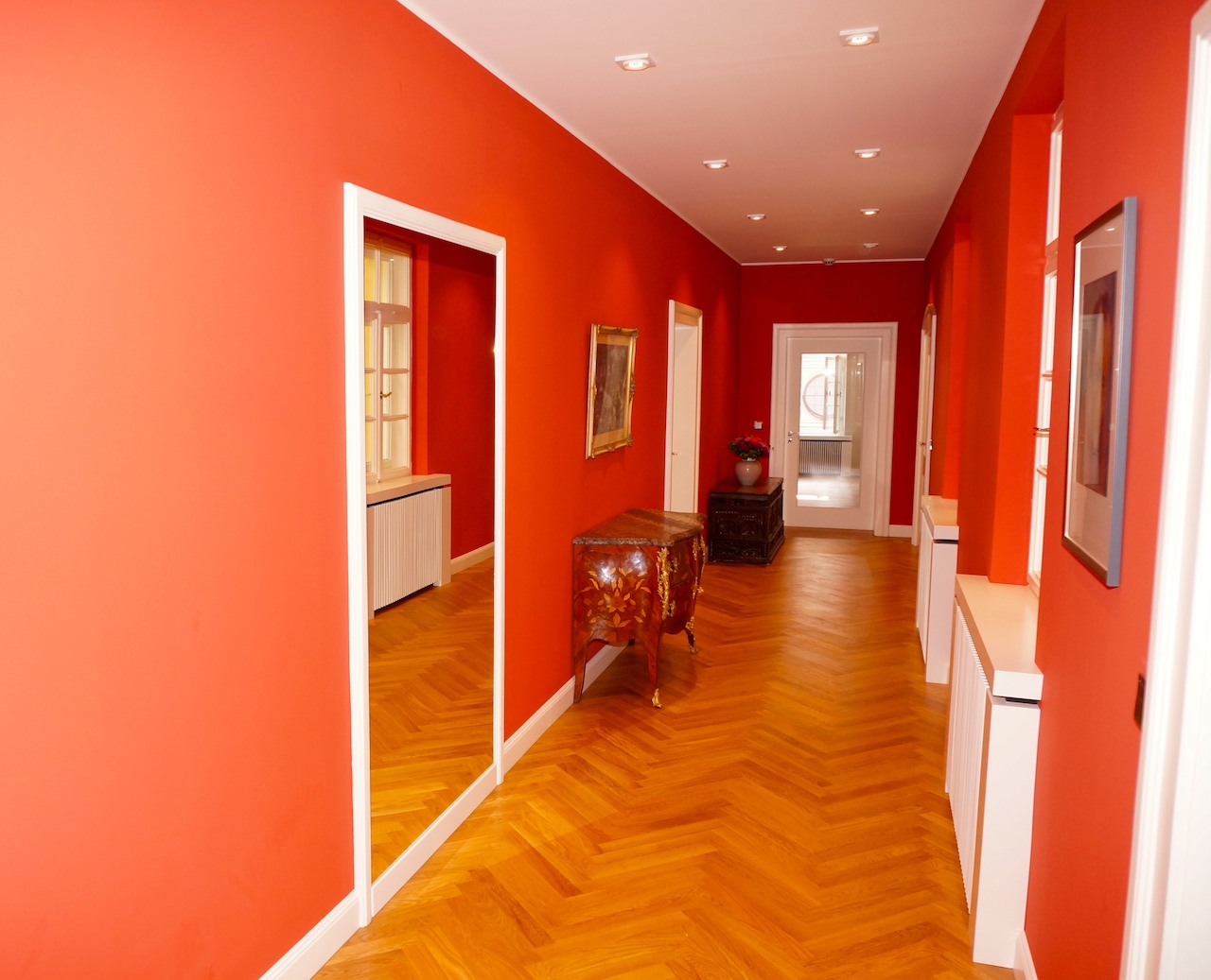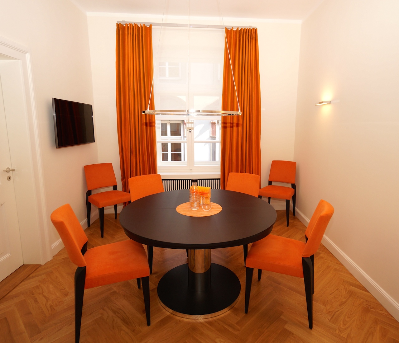 Die geschmackvolle und farbenfrohe Einrichtung wurde in Detailarbeit über einen längeren Zeitraum konzipiert und entschieden. Um dem Stil des historischen Hauses treu zu bleiben, wurden ruhige Formensprachen und dennoch kräftige Farben miteinander kombiniert.