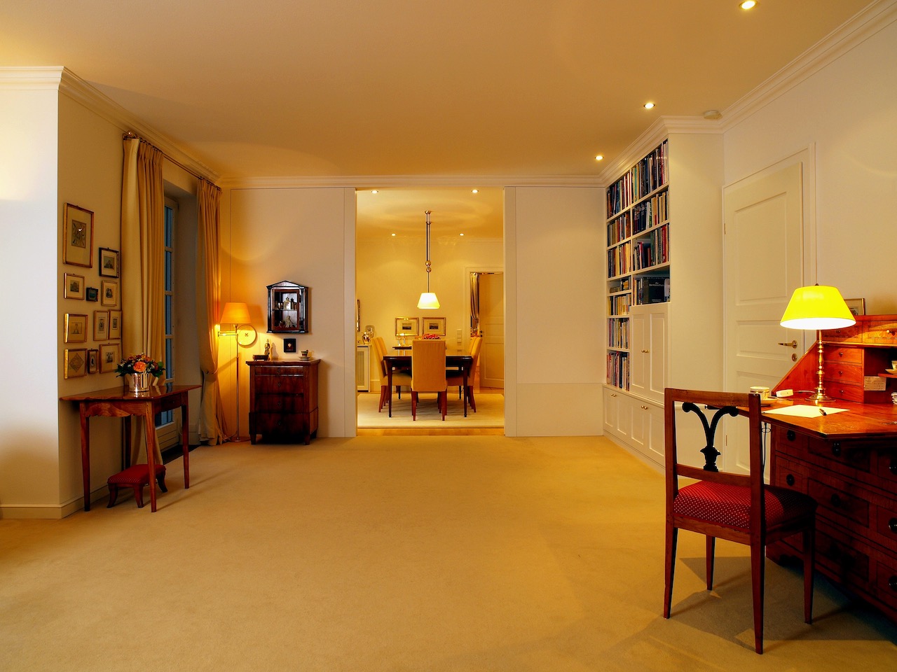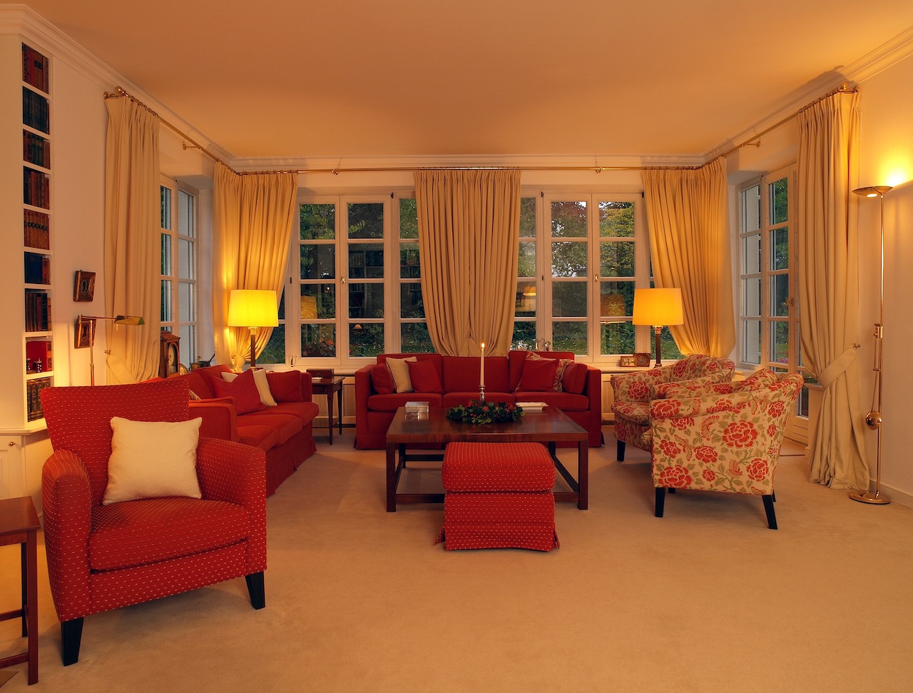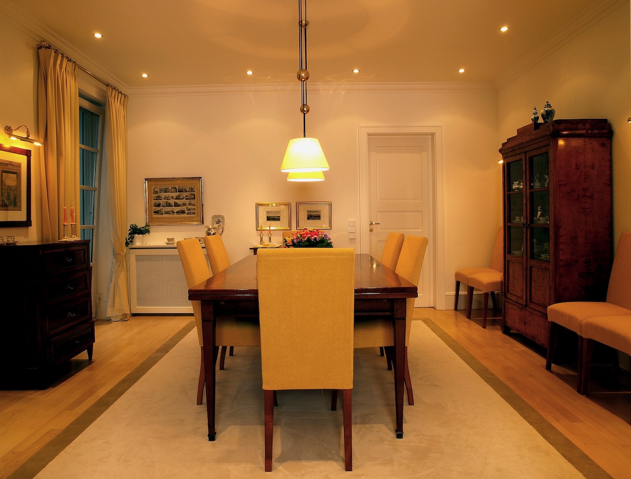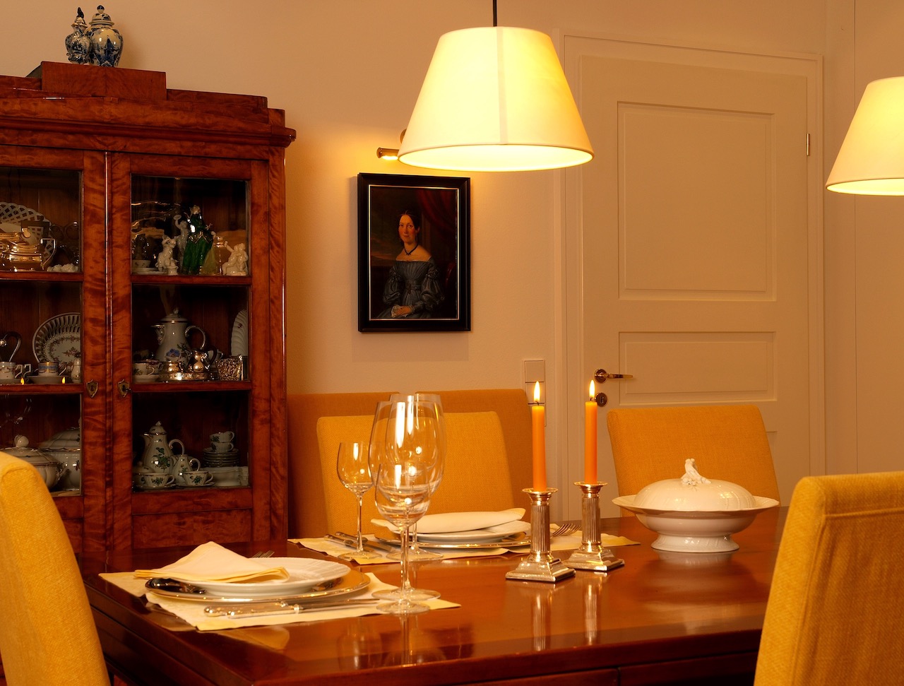 Besonders wichtig, war die prächtige und geschmackvolle Vorhangdekoration in Kombination mit wertigen Messing, glänzenden Oberflächen und haptisch wertvoller Teppichware. Die Leuchten wurden in Abstimmung zu den bestehenden, antiquarischen Lampen durch das Sortiment von der VS Lichtmanufaktur gefertigt. Die hochwertig und ästhetisch ansprechenden Lampen, stehen dank der Handwerksarbeit jeder einzelnen Leuchte, für höchste Qualität.