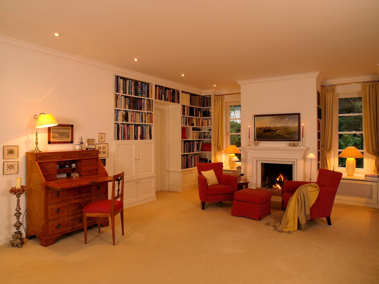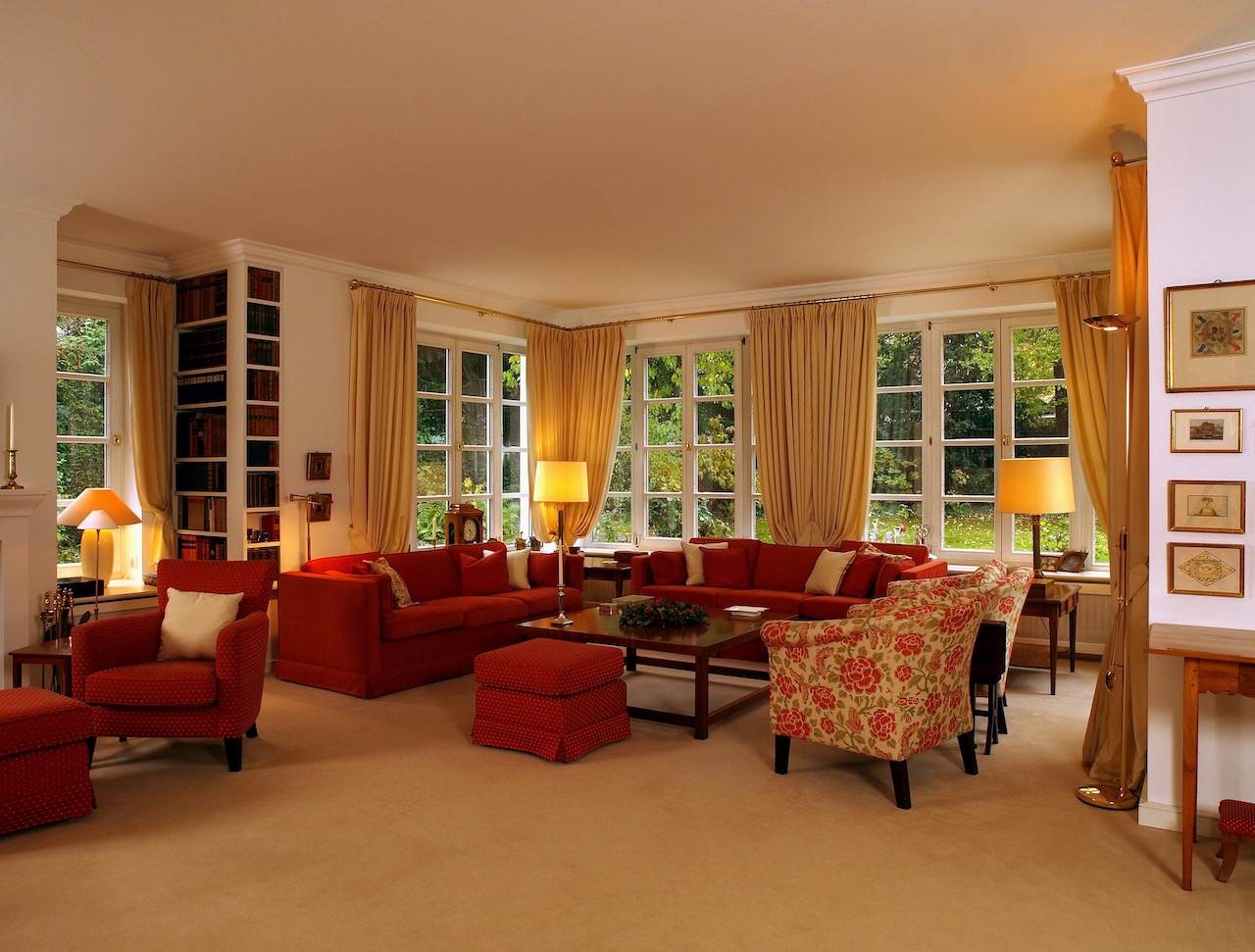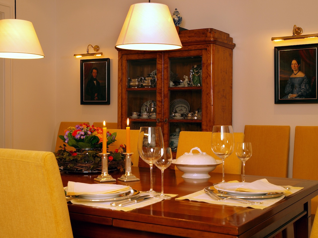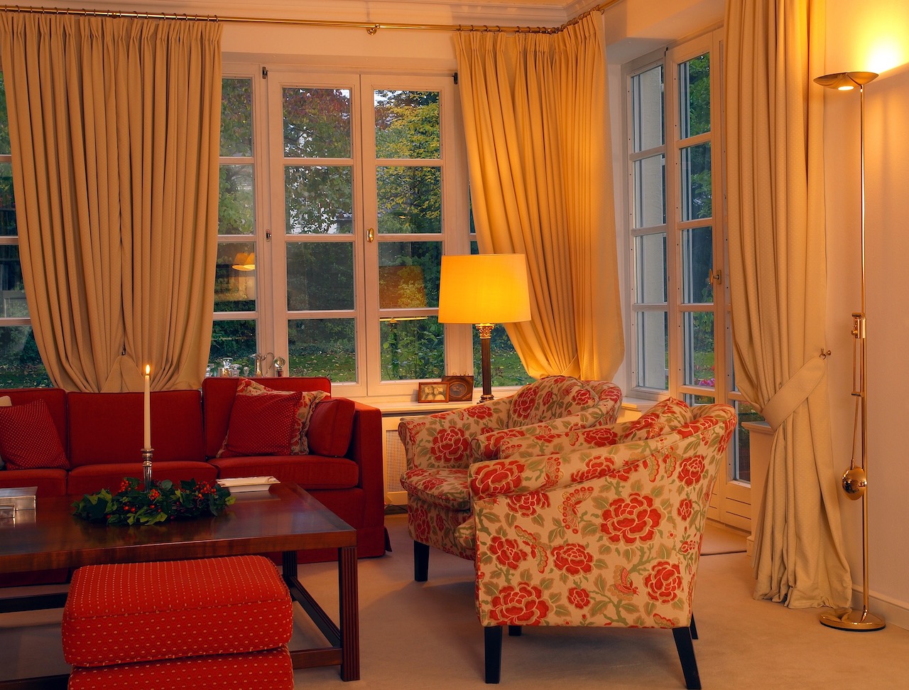 Besonders wichtig, war die prächtige und geschmackvolle Vorhangdekoration in Kombination mit wertigen Messing, glänzenden Oberflächen und haptisch wertvoller Teppichware. Die Leuchten wurden in Abstimmung zu den bestehenden, antiquarischen Lampen durch das Sortiment von der VS Lichtmanufaktur gefertigt. Die hochwertig und ästhetisch ansprechenden Lampen, stehen dank der Handwerksarbeit jeder einzelnen Leuchte, für höchste Qualität.