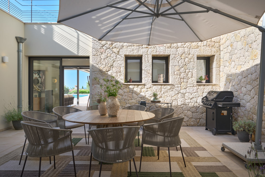 Helle, natürliche Materialien wie Stein und Holz schaffen ein einladendes Ambiente, während großzügige Fenster und Terrassen den Blick auf die umliegende Landschaft öffnen. Ein Pool im gepflegten Garten lädt zum Entspannen ein. Die Innenräume sind persönlich und komfortabel gestaltet, mit frischen Farbnuancen und hochwertigen Textilien und Möbeln, die ein Gefühl von Leichtigkeit und Geborgenheit vermitteln. Ideal für den Rückzug aus dem hektischen Alltag.