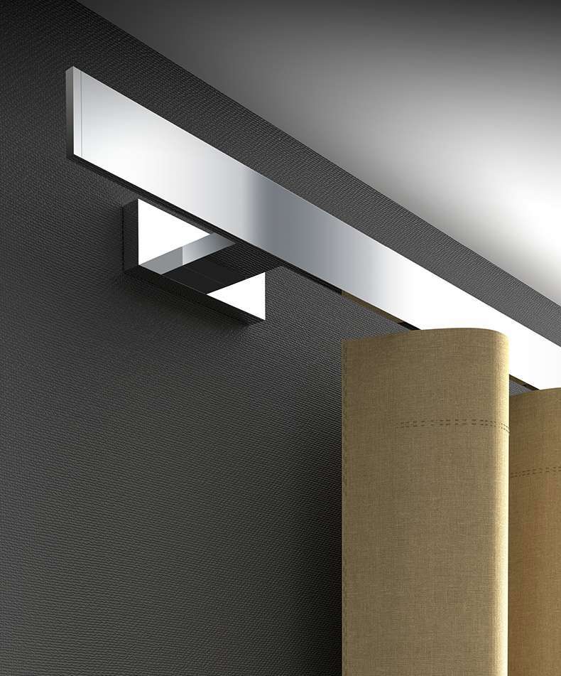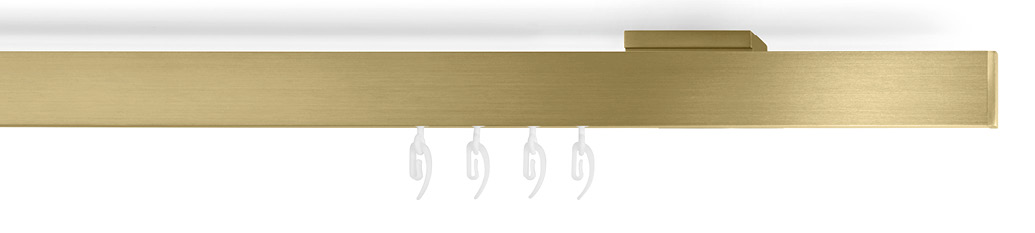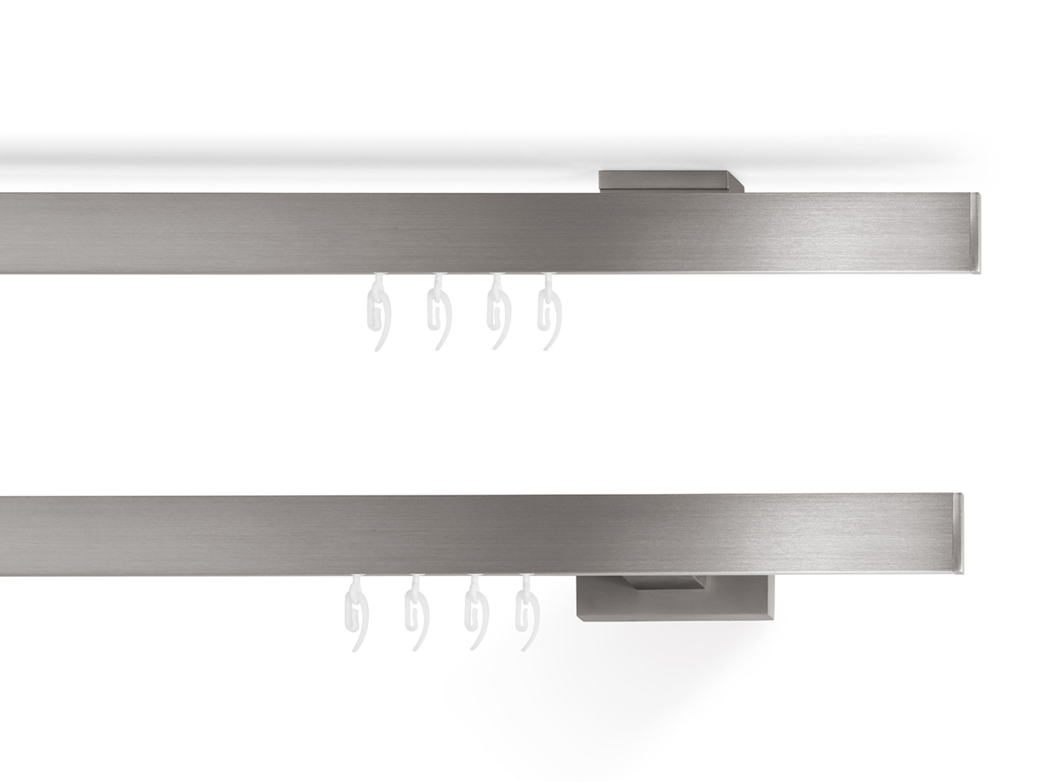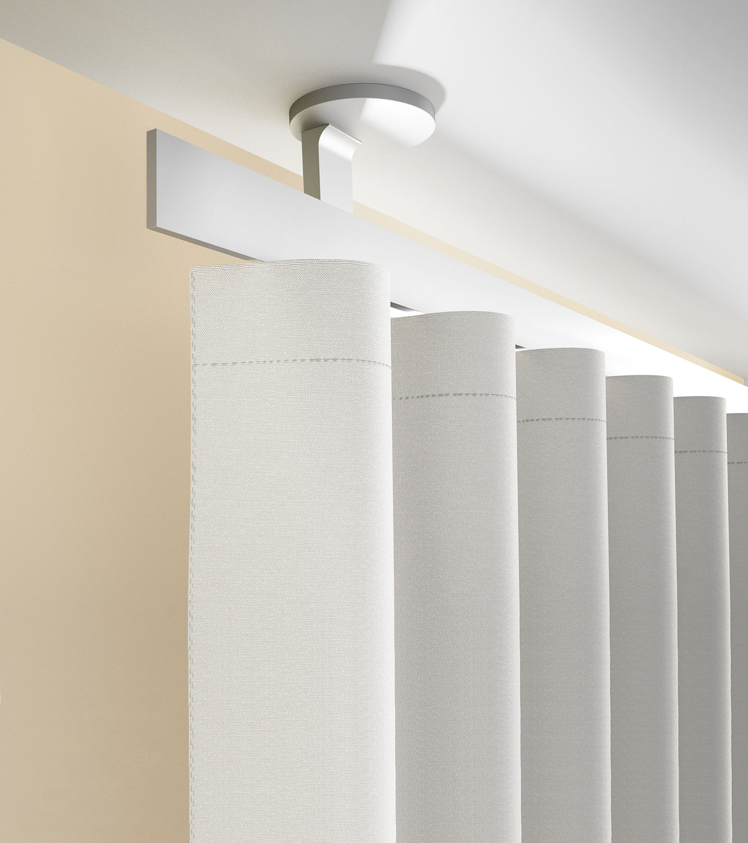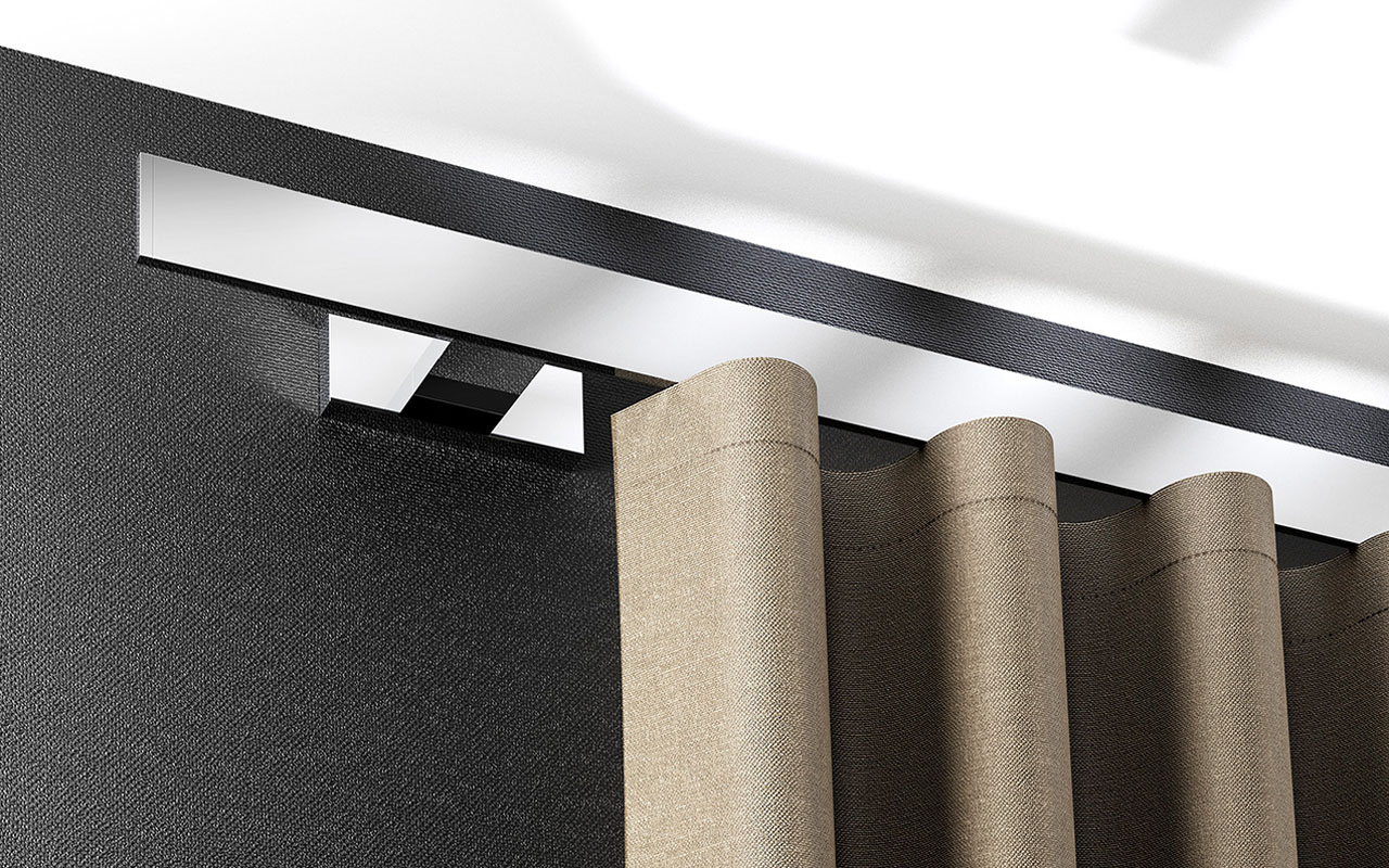 Die mit 5 mm wohl schlankste Blende der Welt verdeckt die ganze Technik des Innenlaufes und wirkt schwebend leicht. Die Deckenhalterung der Schiene ist besonders detailreich geformt und steht im perfekten Kontrast zur Schienenblende. Beim Betrachten wirkt alles wie aus einem Guss und ist dabei in verschiedenen Blendenfarben wie schwarz, weiß, aluminium gebürstet etc. erhätltlich.