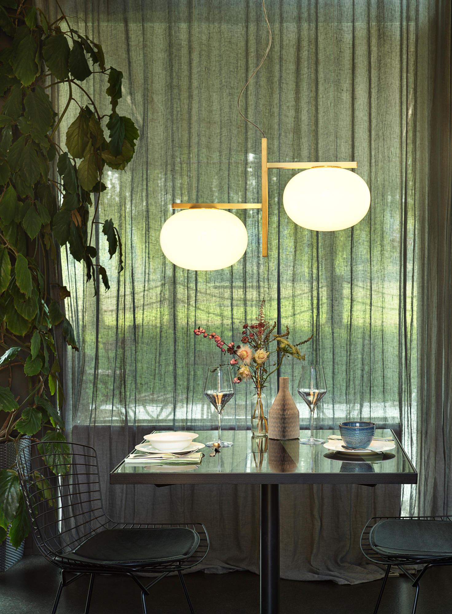 Die Deckenleuchte Alba gibt es in zwei Ausführungen: der einzelne, pure durch ein Kabel aufgehängte anmutige Tropfen, und die doppelte Variante, mit zwei versetzten messing-satinierten Armen.