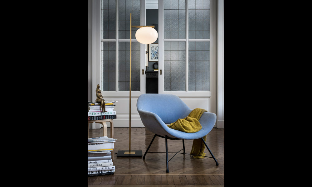 In der Version mit Tischleuchte ruht der Tropfen zart auf einem satinierten Messingprofil mit rechteckigem Querschnitt in Form eines doppelt asymmetrischen "L", das als Basis und Verzierung des Lichts dient.