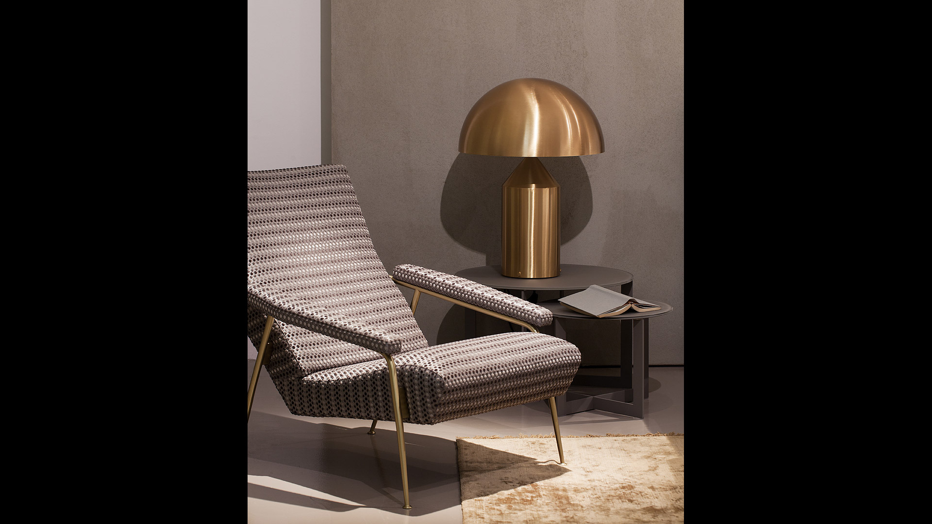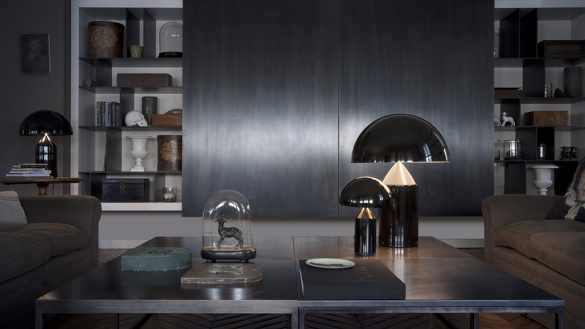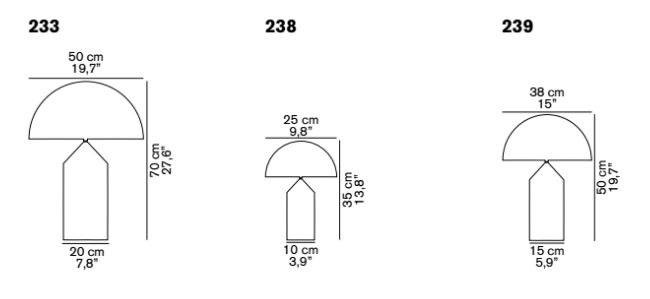 Atollo ist in drei verschiedenen Größen und in verschiedenen Oberflächen erhältlich: Gold, Schwarz Metall, Opalglas und Messing brüniert.