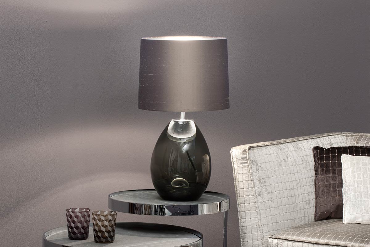 Der eiförmig gerundete Fuß aus mundgeblasenem Glas vermittelt Leichtigkeit und Eleganz. Dabei bedeuten eventuelle Luftbläschen im Material keinen Qualitätsverlust, im Gegenteil, jede Tischlampe Grace wird dadurch zu einem einzigartigen Designerstück.