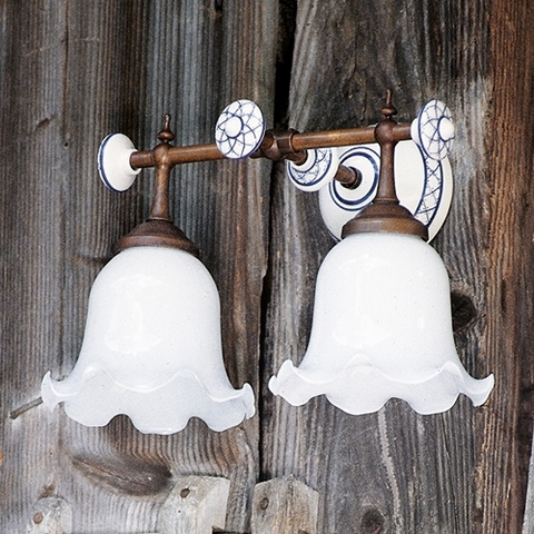 Die Keramikteile sind mit handbemaltem blauem Dekor oder in weiß ohne Dekor erhältlich. Die Schirme sind aus mundgeblasenem glattem Glas oder Plissé-Milchglas gefertigt und erhältlich.