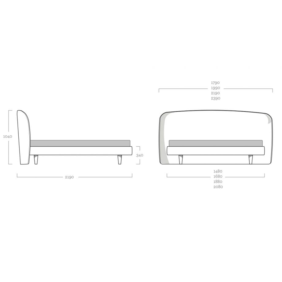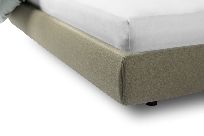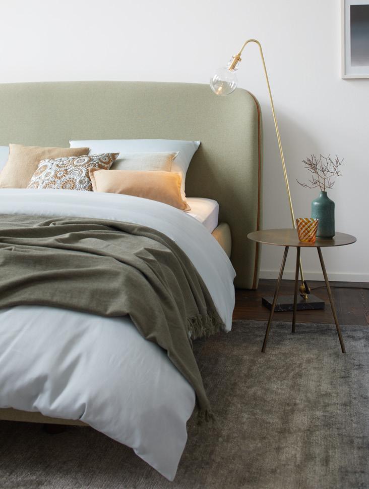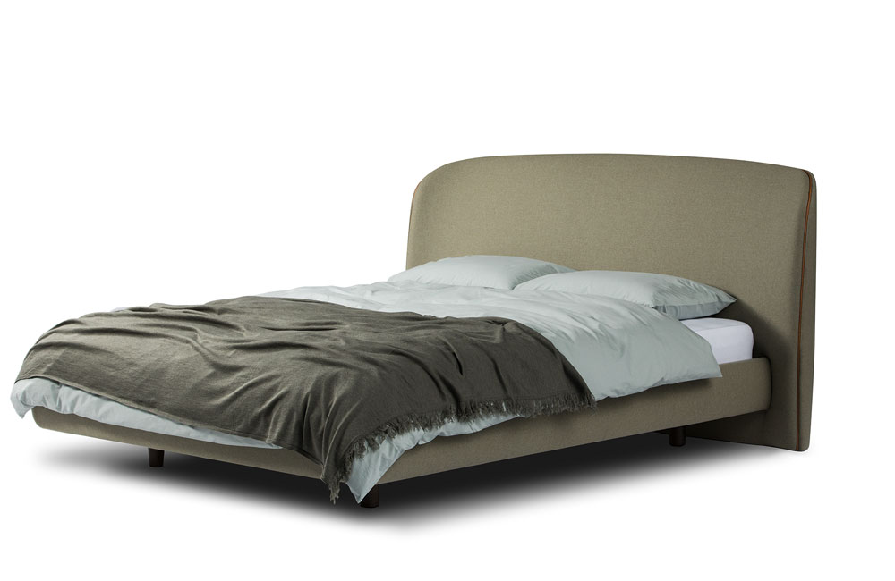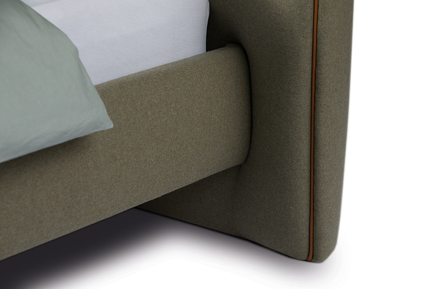 Zurückgesetzte, niedrige Füße lassen den gepolsterten Rahmen mit umlaufender, abnehmbarer Housse optisch schweben. Ein bodentiefes, sanft geschwungenes Kopfteil sorgt für Erdung und behaglichen Rückhalt.