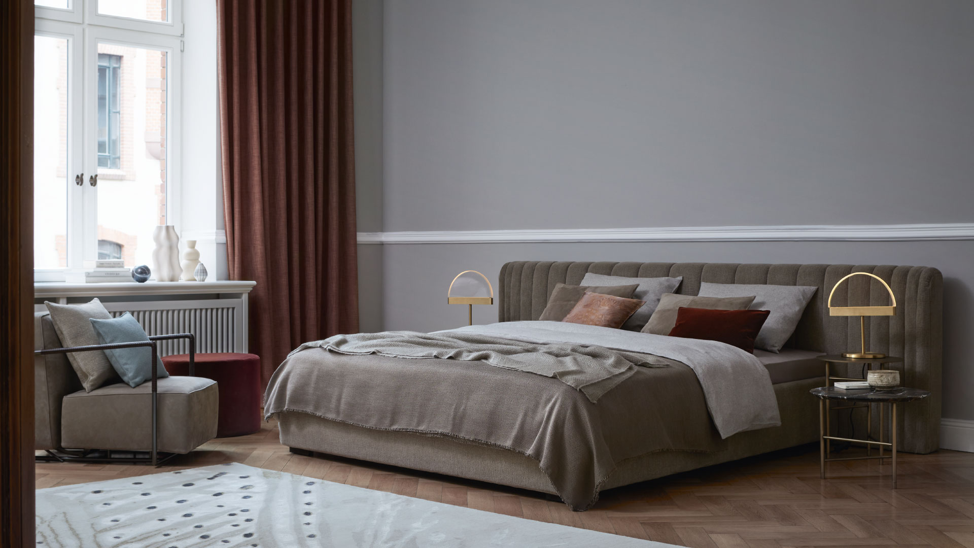 Das Design des Kopfteils spricht die Sinne an. So fesselt das Relief der ausdrucksstarken Wölbungen den Blick und greift spannungsvoll die Sanftheit des matt schimmernden Bezugsstoffs auf. Die Palette der Getreide-, Sand- und Rottöne wird durch edel schimmernde Samte betont.
