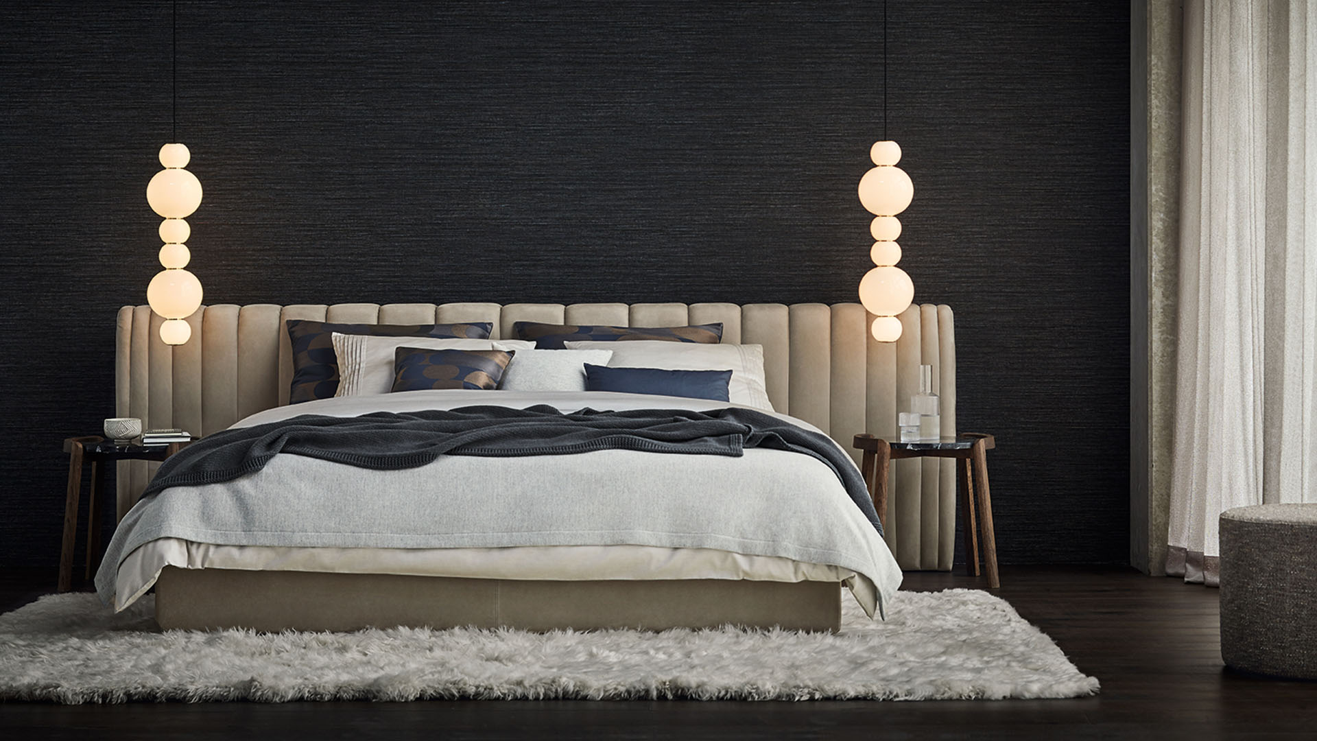 Mit einer sich nach außen verdichtenden vertikalen Steppung verkörpert das Bett „Gradient“ die Extravaganz des Art déco.