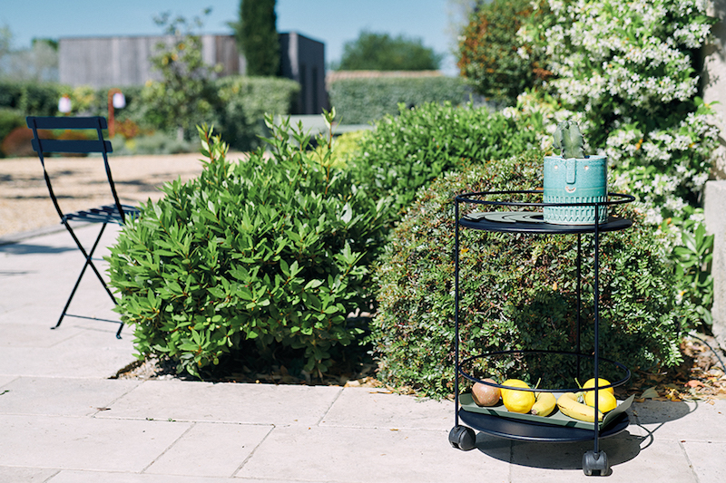 Guéridons ist mit Rollen und zwei Ablagefächern sehr praktisch, da er sowohl im Haushalt sowie im Außenbereich einsetzbar ist.
