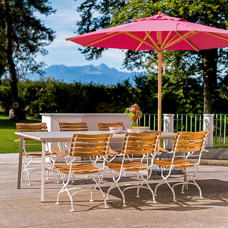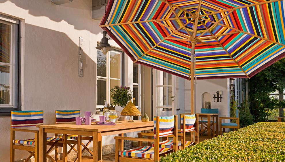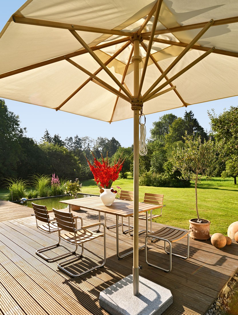 Den Klassiker Schirm gibt es in zahlreichen Schrimgrößen, sowohl in rund wie auch quadratisch und rechteckig. Als Bodenplatte stehen unterschiedliche Qualitäten sowie Größen zur Auswahl.