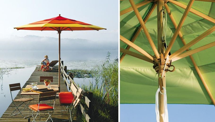 Das Gestell dieser klassischen Schirme wird ausschließlich aus Holz gefertigt und ist oberflächenimprägniert. Die Segeltücher der Bespannungen bestehen aus gewebeverstärktem Baumwollmischgewebe oder aus DOLAN® (100% Acrylgewebe).