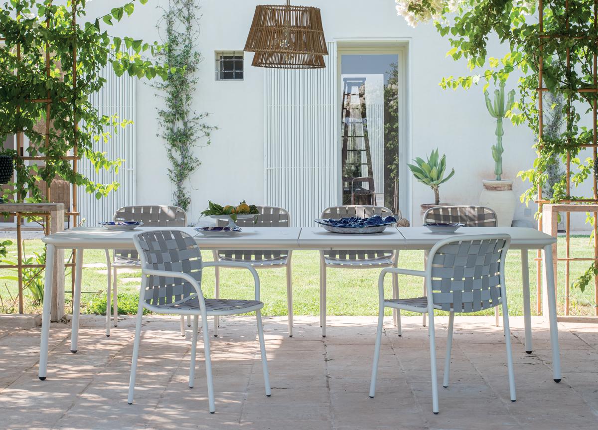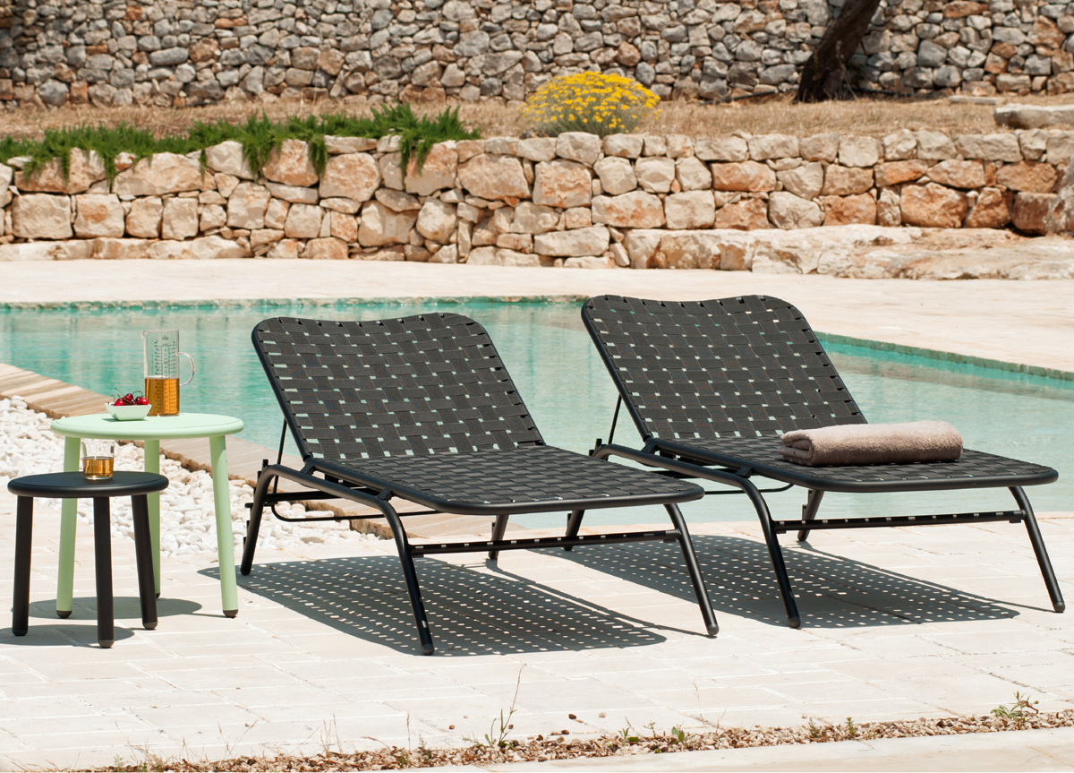 Die gewebten elastischen Bänder, die auf innovative Weise mit dem raffinierten Aluminiumrahmen verbunden sind, erwecken eine Kollektion zum Leben, die sich durch herausragenden, vielseitigen Stil und hervorragenden Komfort auszeichnet und perfekt für den Außenbereich geeignet ist.