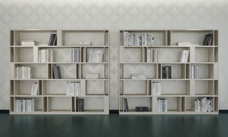 Die Besonderheit des Bücherregals Brera, ist die Fertigung aus lackiertem Holz in Kombination mit vertikale Tragstützen, die die Linearität der langen Regalböden unterbrechen.