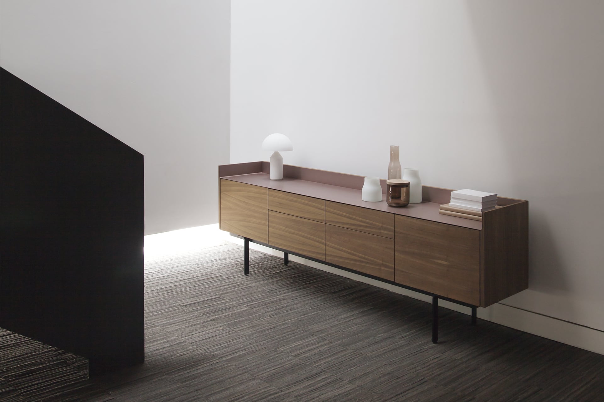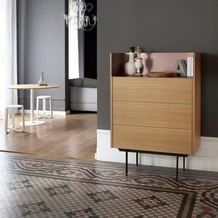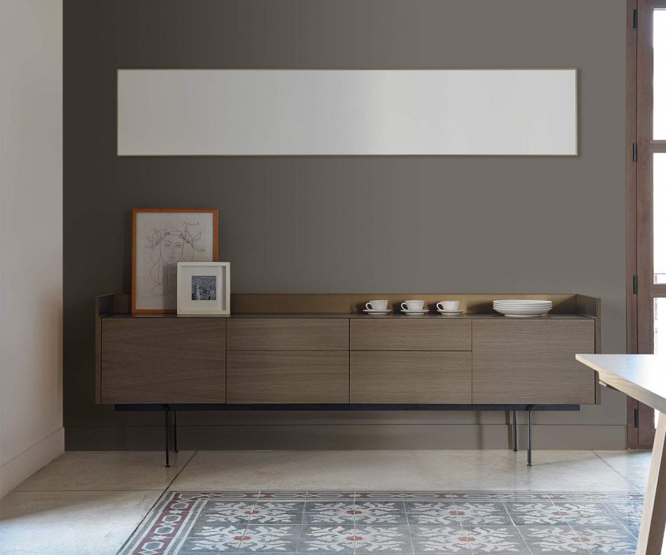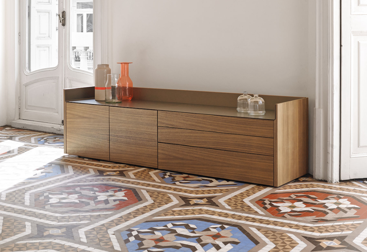 Charakteristisch hierbei ist das Aluminium-Finish auf Oberseite der Möbel in wahlweise 4 Farben. Die Möbel sind in unterschiedlichen Holzausführungen wie Eicheist und Nussbaum sowie