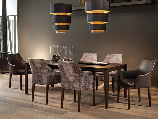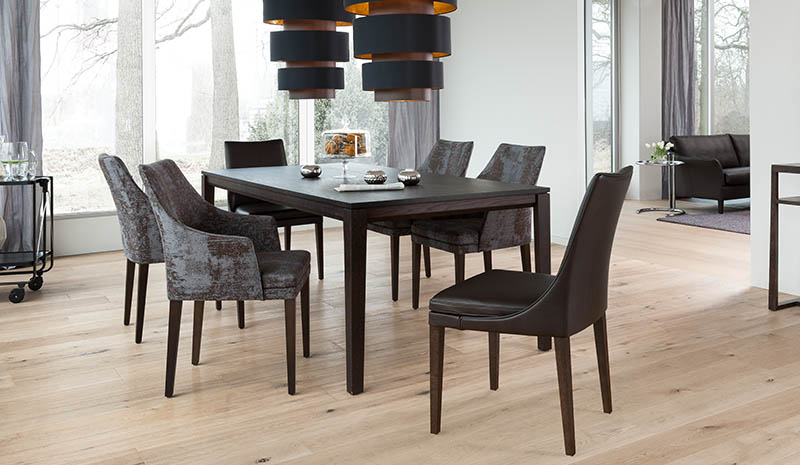 Der Stuhl ist sowohl in Stoff- wie auch Lederausführung und mit oder ohne Armlehnen verfügbar.