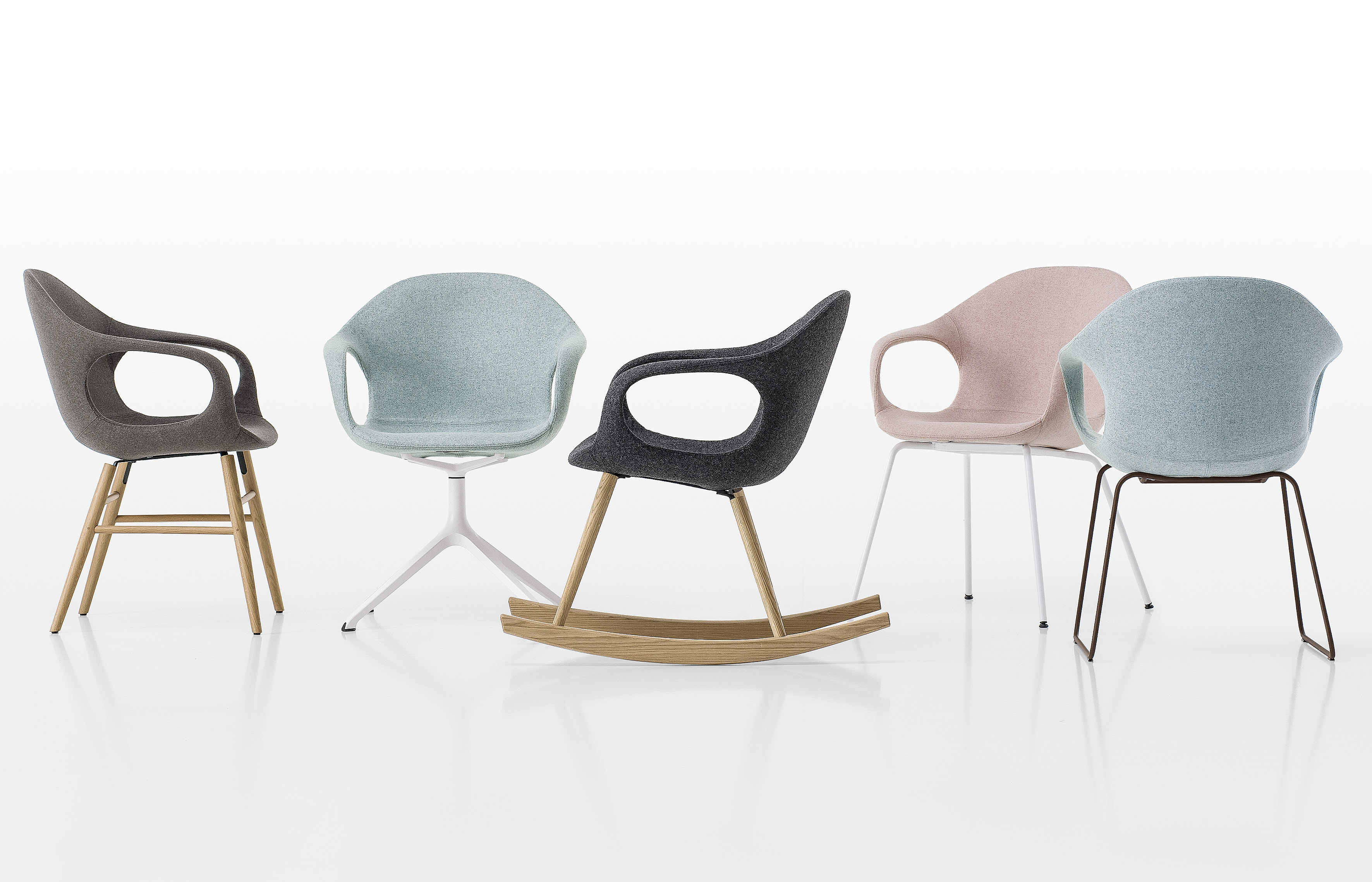 Die Stuhlbeine sind außerdem als vierbeiniges oder kufenförmiges Grundgestell oder einem Mittelfuß in verchromter, satinierter oder farbig lackierter Ausführung erhältlich.
