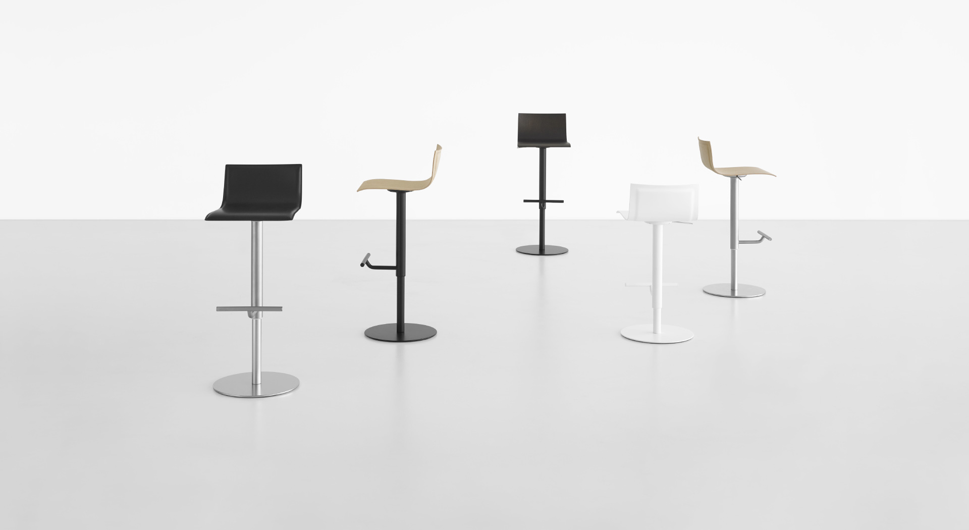 Das Gestell gibt es mit klassisch vier Füßen, Kufen oder einem Mittelfuß sowie für Arbeitsbereiche mit Rollen. Das Holz für den Sitz ist in unterschiedlicher Materialstärke, bzw. es sind diverse Lederqualitäten lieferbar.