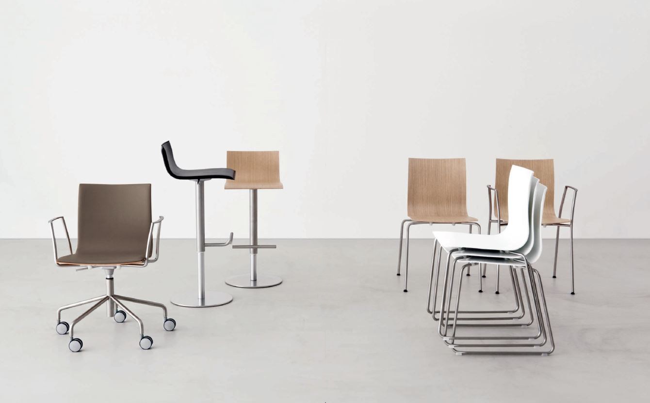Der Stuhl ist wahlweise mit Holzschale, Leder-/Stoffbezug oder als drehbarer Barhocker mit Höhenverstellung sowie einem Gestell aus sandgestrahltem Edelstahl erhältlich.