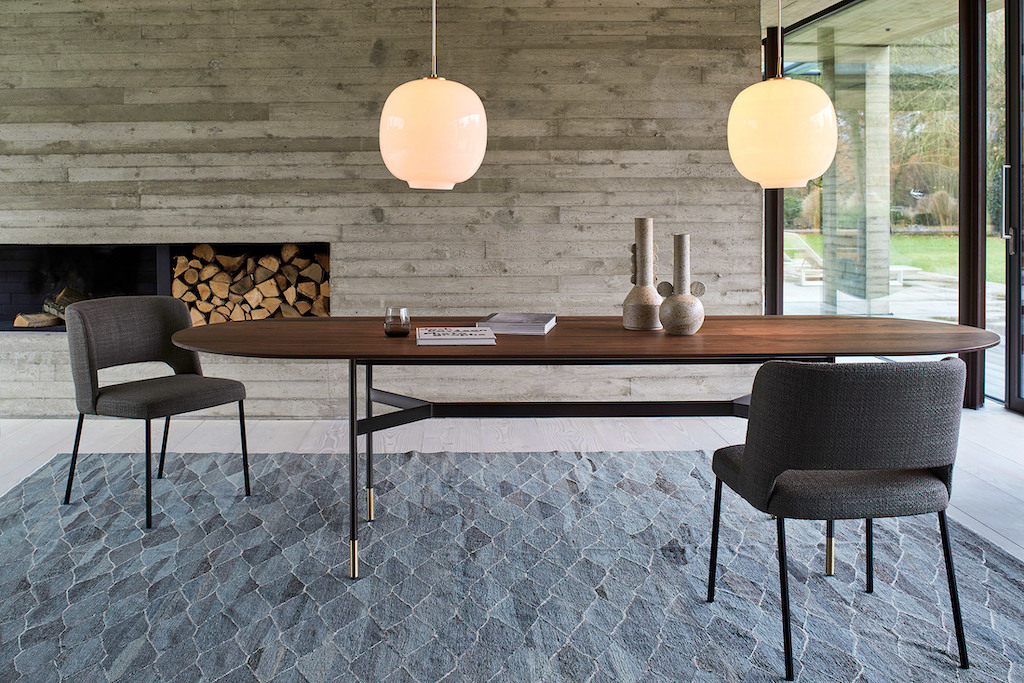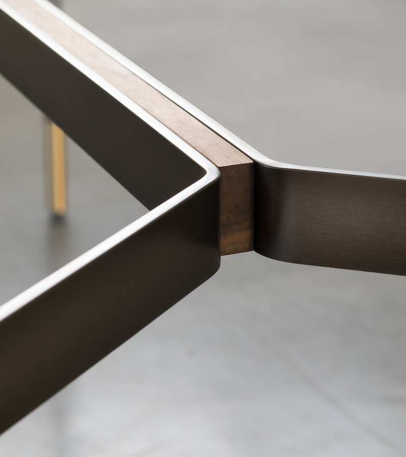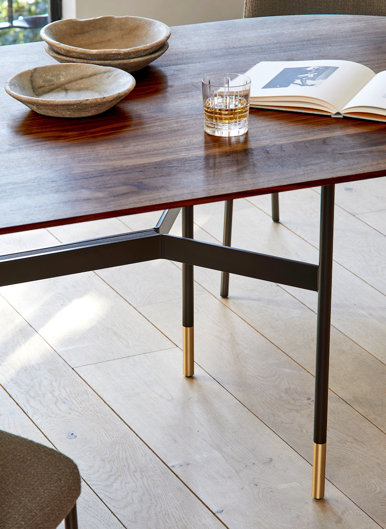 Tisch Harri erscheint auf den ersten Blick zurückhaltend aber besondere Details wie optionale Messingabschlüsse an den Tischbeinen und eine Holzeinlage im Gestell zeigen, dass eine hochwertige Verarbeitung und Detailliebe im Fokus steht.