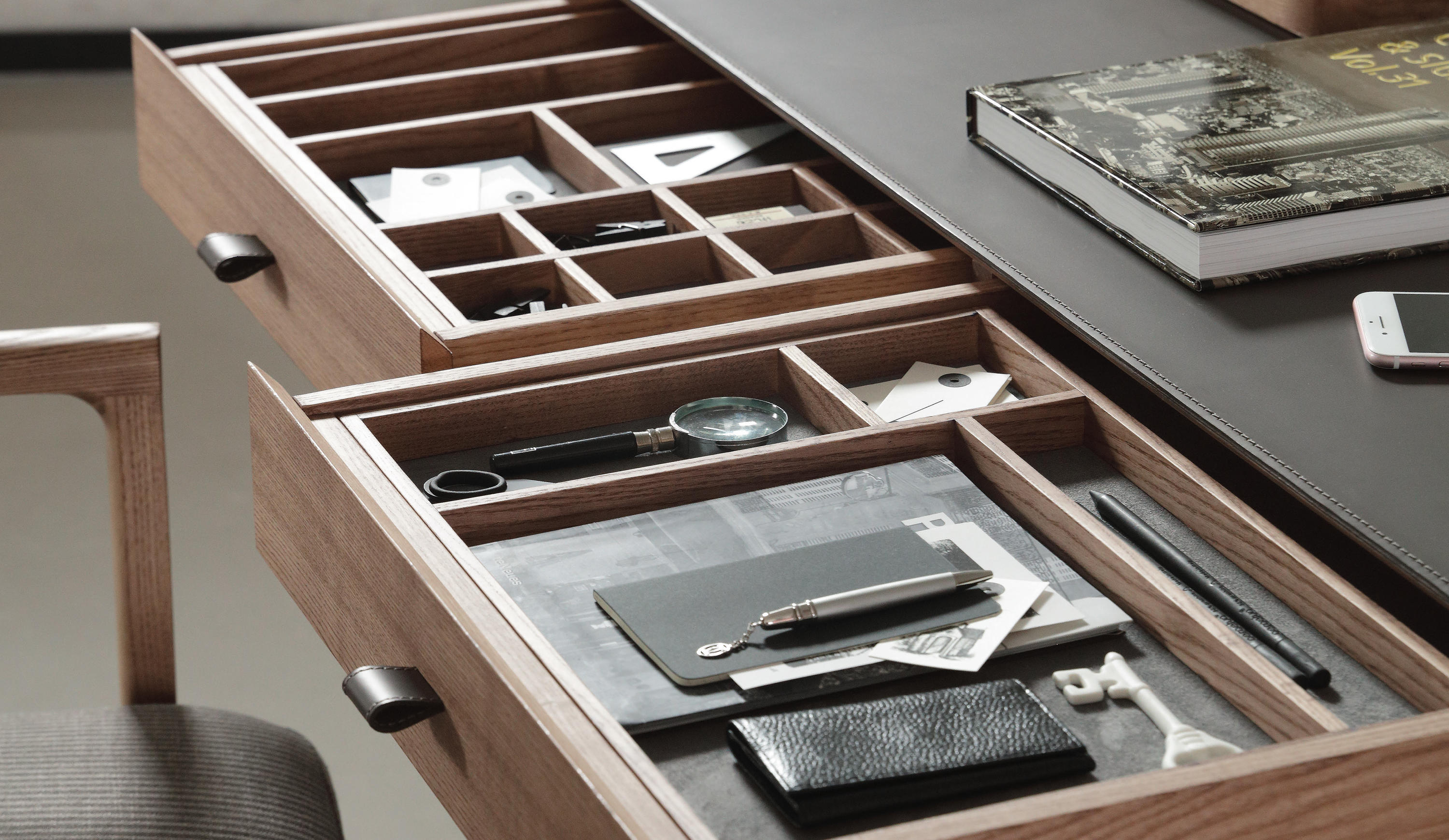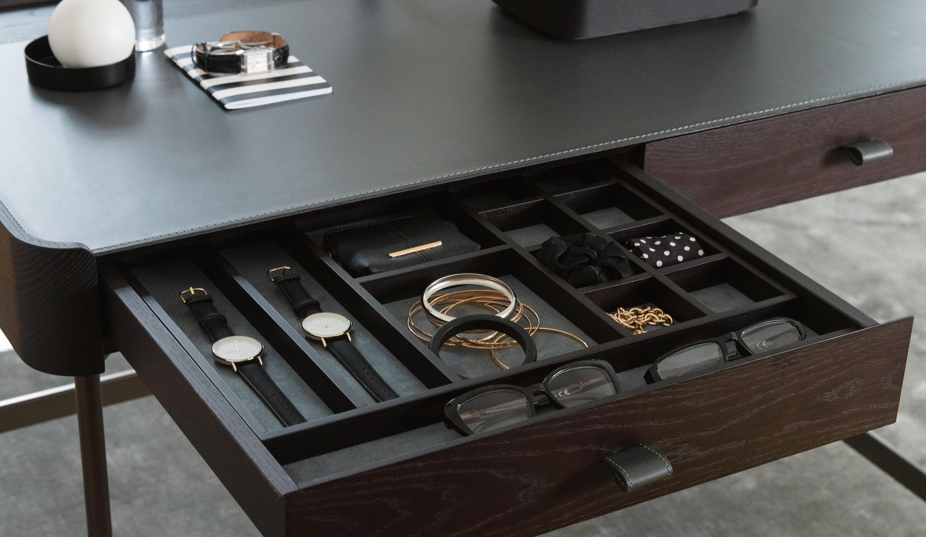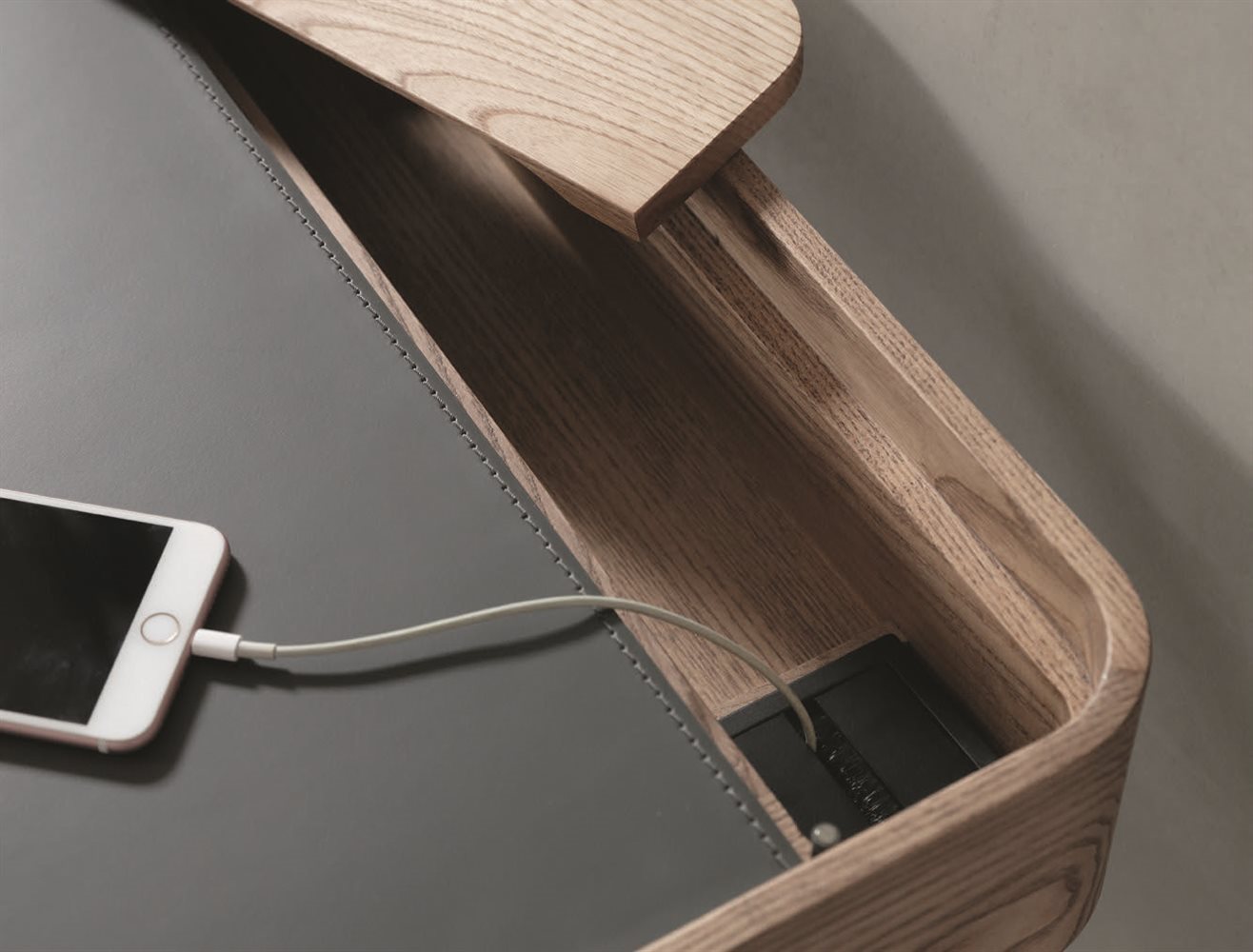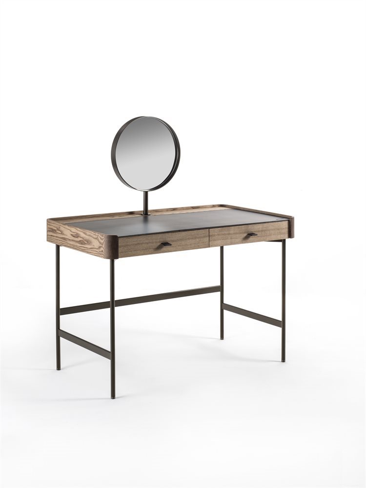 Wahlweise ist der Tisch in verschiedenen Holzoberflächen sowie mit oder ohne Spiegel erhältlich. Die Tischfläche ist aus hochwertigem Cuoietto-Leder, welches ebenfalls in den zwei Aufbewahrungsschubladen mit Griffen wieder aufgegriffen wird. Hierbei stehen Ihnen verschiedene Lederfarben zur Auswahl. Um unschöne und sichtbare Kabel zu verstecken, hat der Tisch zwei magnetische Klappen unter denen sich ein Kabelauslass befindet.