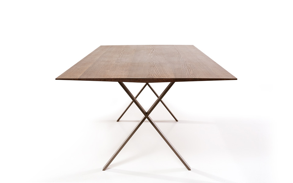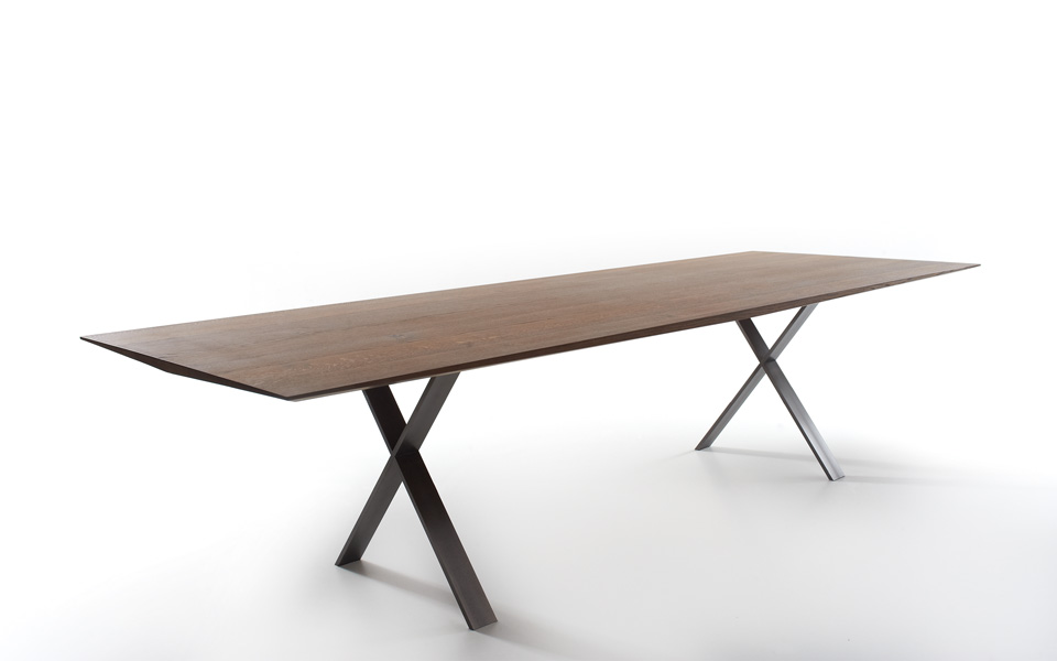 Das Besondere an der Tischplatte sind die breiten Massivholzplanken und die Tischkanten, die nicht nur vom Kopf, sondern auch an den Längsseiten zu den Ecken auf 1 cm auslaufen und den Tisch somit schwerelos erscheinen lassen.