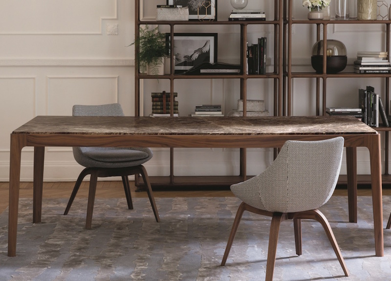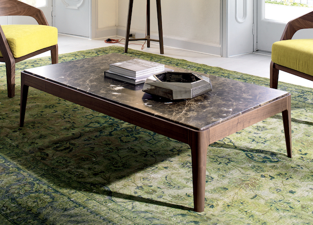 Die Tischplatte kann in drei Marmorfarben - schwarzem Marquina Marmor, weißem Calacatta Marmor und braunem Emperador Marmor oder in Canaletta Walnuss entsprechend dem Rahmen gewählt werden.