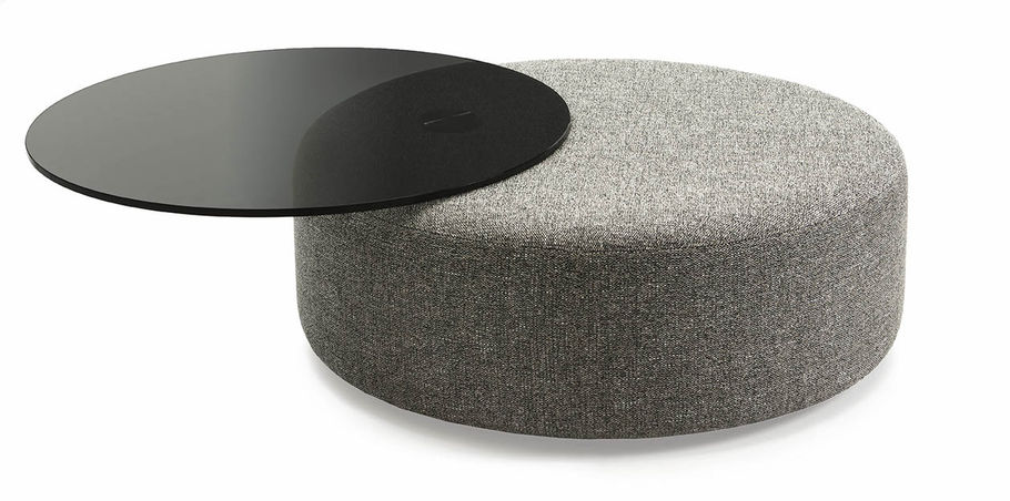 Der Clou: Die am Hocker befestigte Rauchglasplatte kann zum einen als Abstellfläche dienen, zum anderen lässt diese sich „ausschwenken“, so dass man sich mit ein oder zwei Personen auf den Hocker setzen und dabei einen Kaffee abstellen oder auch eine Zeitschrift bequem neben sich ablegen kann.