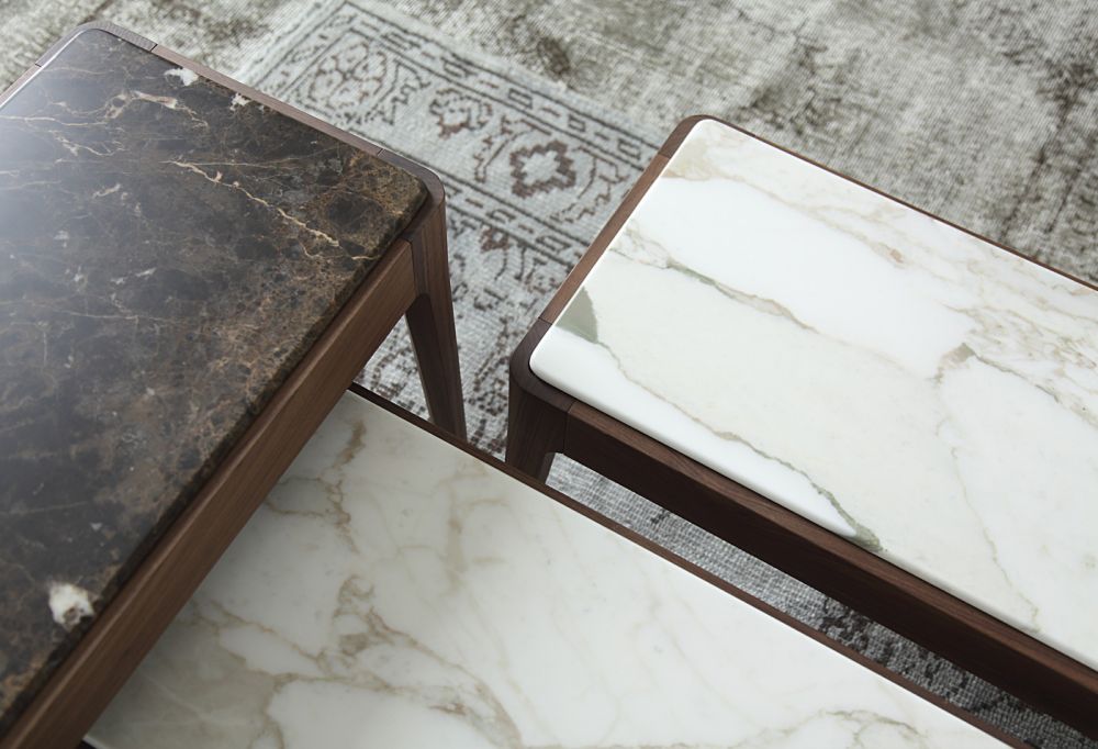 Der Rahmen ist in drei Breiten und zwei verschiedenen Höhen erhältlich. Die Tischplatte kann in drei verschiedenen Marmorfarben gewählt werden - schwarzer Marquinamarmor, weißer Calacatta-Marmor und brauner Emperador Marmor oder in Canaletta-Nussbaum passend zum Rahmen.
