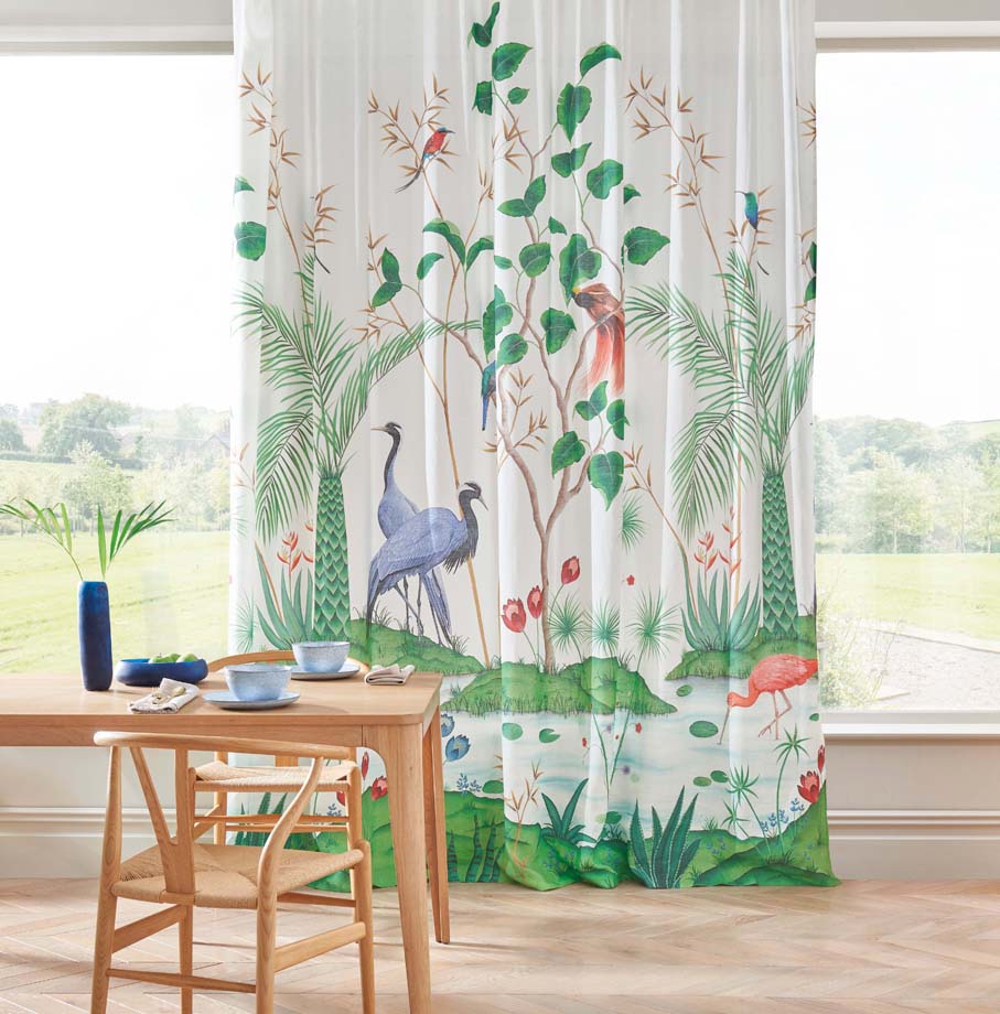 Die Empyrea-Stoffkollektion durchquert Kontinente zu realen und imaginären Ländern, mit malerischen Szenen und Gärten, mit exotischen Vögeln, Blättern und Pflanzen.