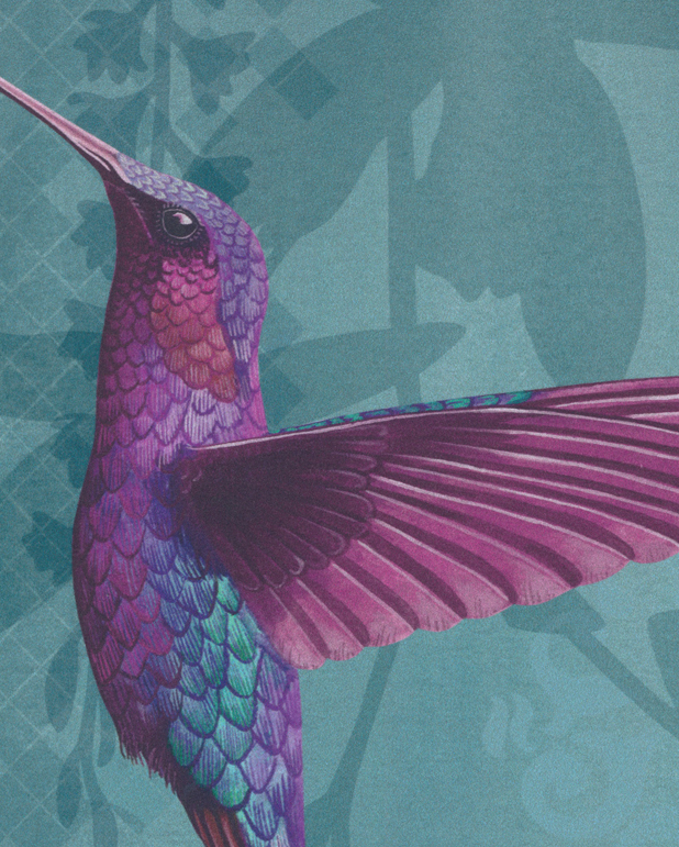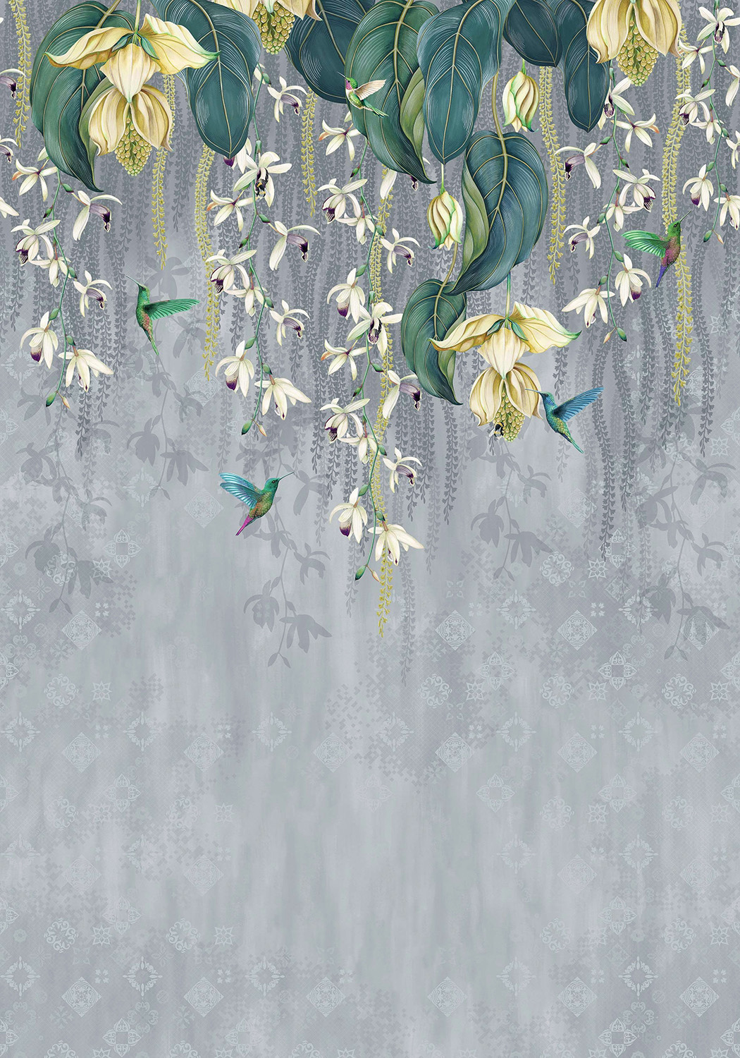 Die Tapete Trailing Orchid zeit übergroße Orchideen, die von oben nach unten wachsen, während exotisch gefiederte Kolibris darunter hindurch schießen. Jede Tapetenrolle besteht aus drei verschiedenen Paneelen. Erhältlich ist das Motiv in zwei Farben: rosa Orchideen auf wässrigem, blaugrünem Boden sowie gelbe Orchideen auf Mittelgrau.