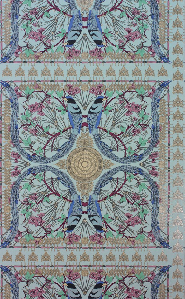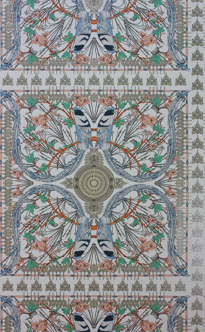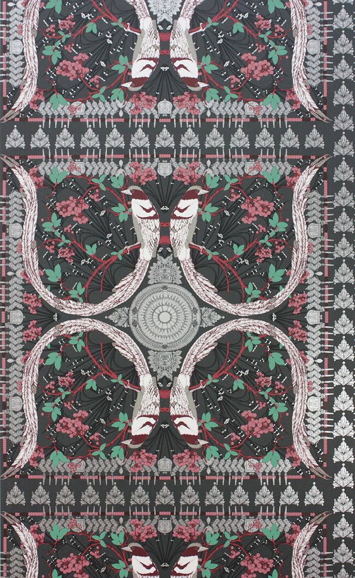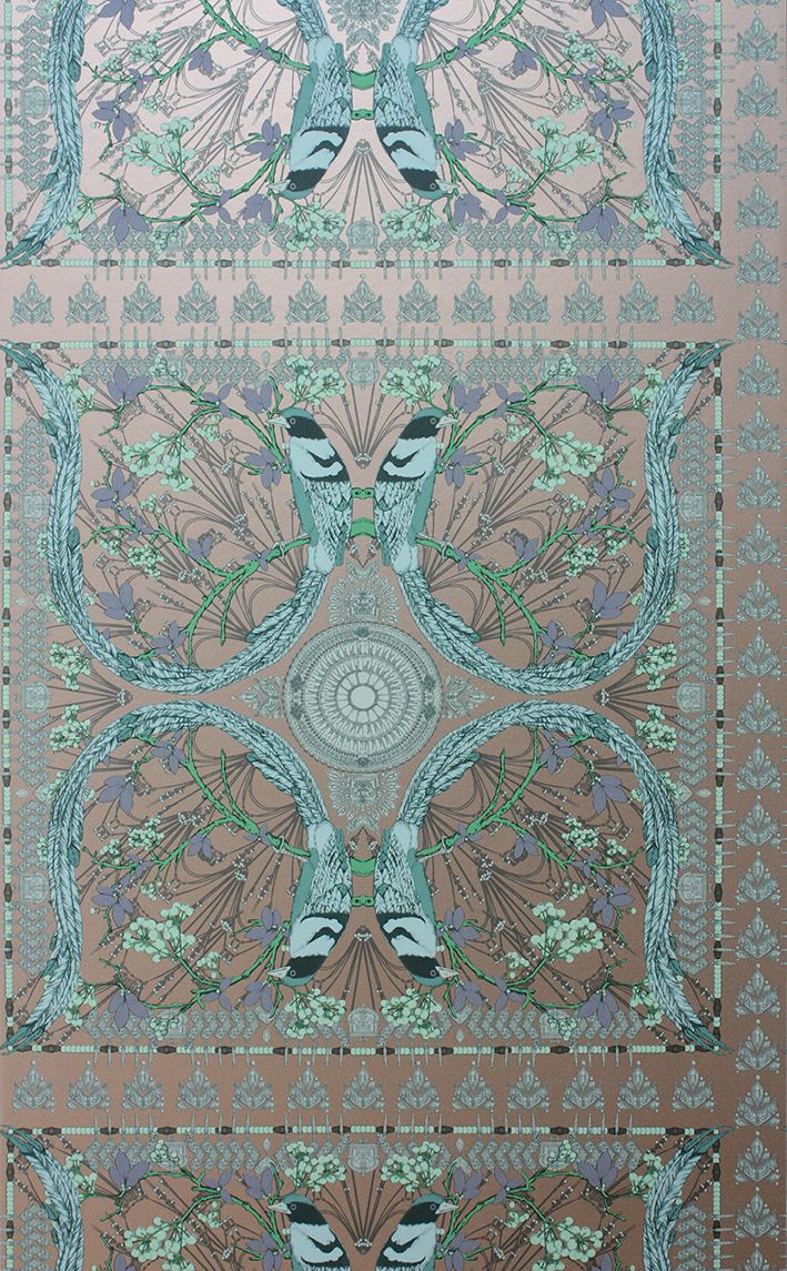 Die langen geschwungenen Schwänze von eleganten Vögeln bilden hierfür die vier Ecken eines großen, kunstvoll gemusterten Quadrats, das sich wie eine Fliese wiederholt.