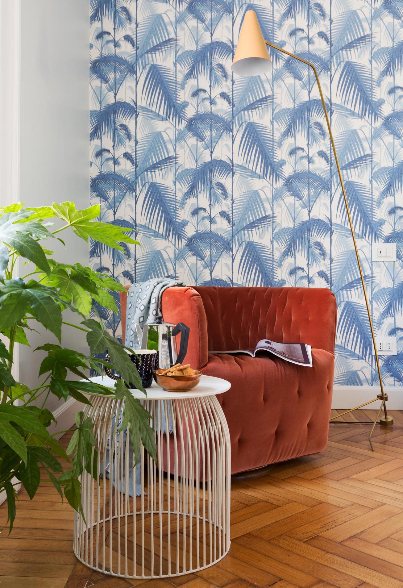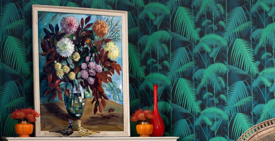 Der Wandschmuck ist wie geschaffen für Wohn- und Badezimmer sowie andere Rückzugsorte. Außerdem gibt es das klassische Cole & Son - Design Palm Leaves auch noch in zwei neuen Farbgebungen: Blattgrün auf Elfenbein und Hellgrau auf Elfenbein.