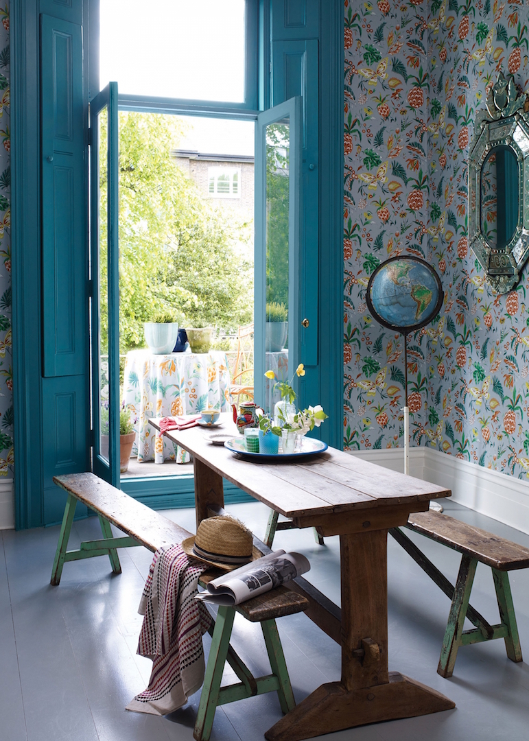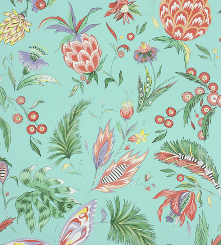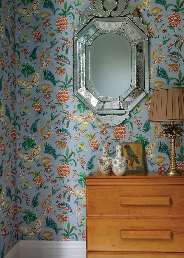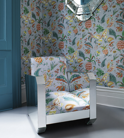 Der rhythmische Tanz aus Kuba dient als Namensgeber für die Tapete Habanera, die Schmetterlinge und Ananasfrüchte präsentiert.
