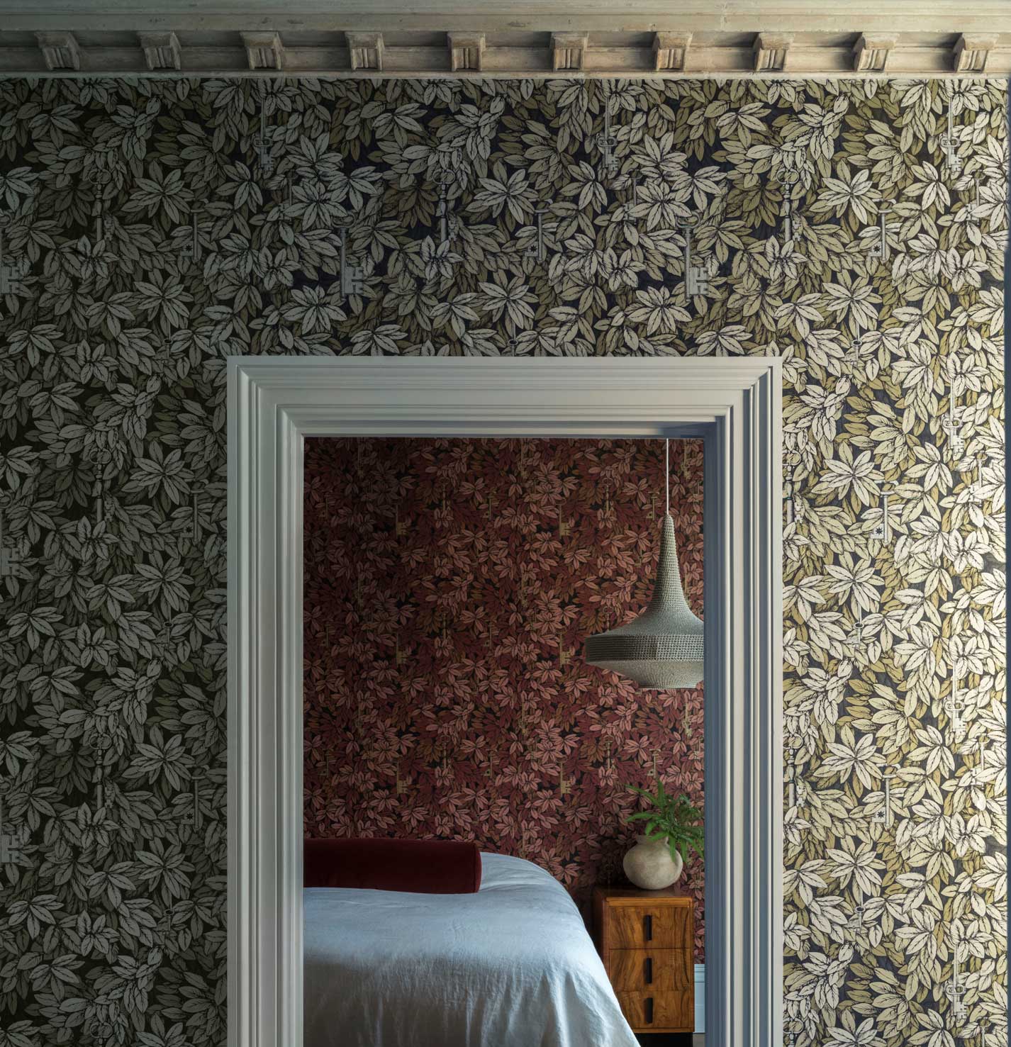 Der beliebte Chiavi Segrete kombiniert zwei einflussreiche Fornasetti-Motive: mystische, dichte Blätter, hinter denen sich goldene, antike Schlüssel verbergen.