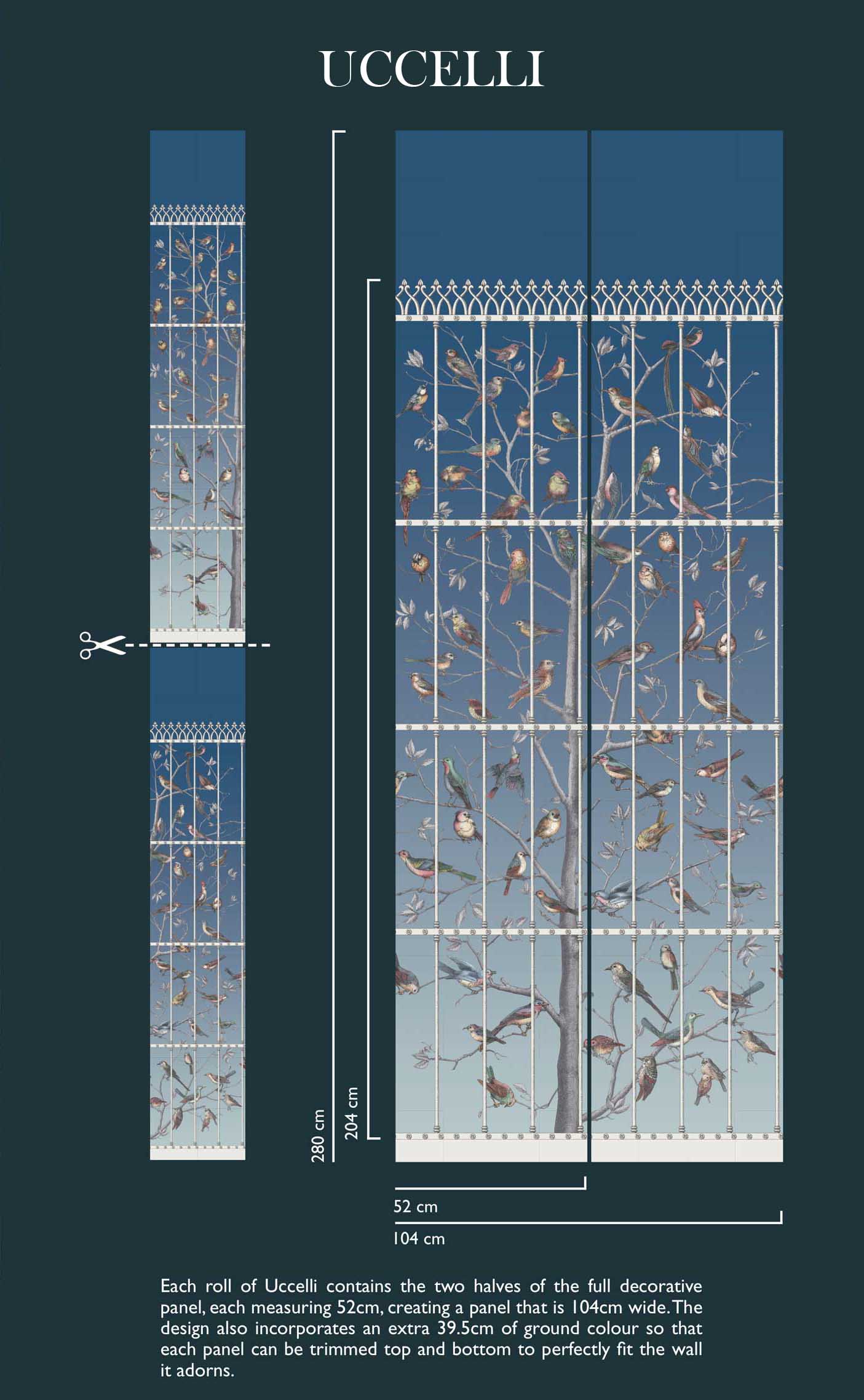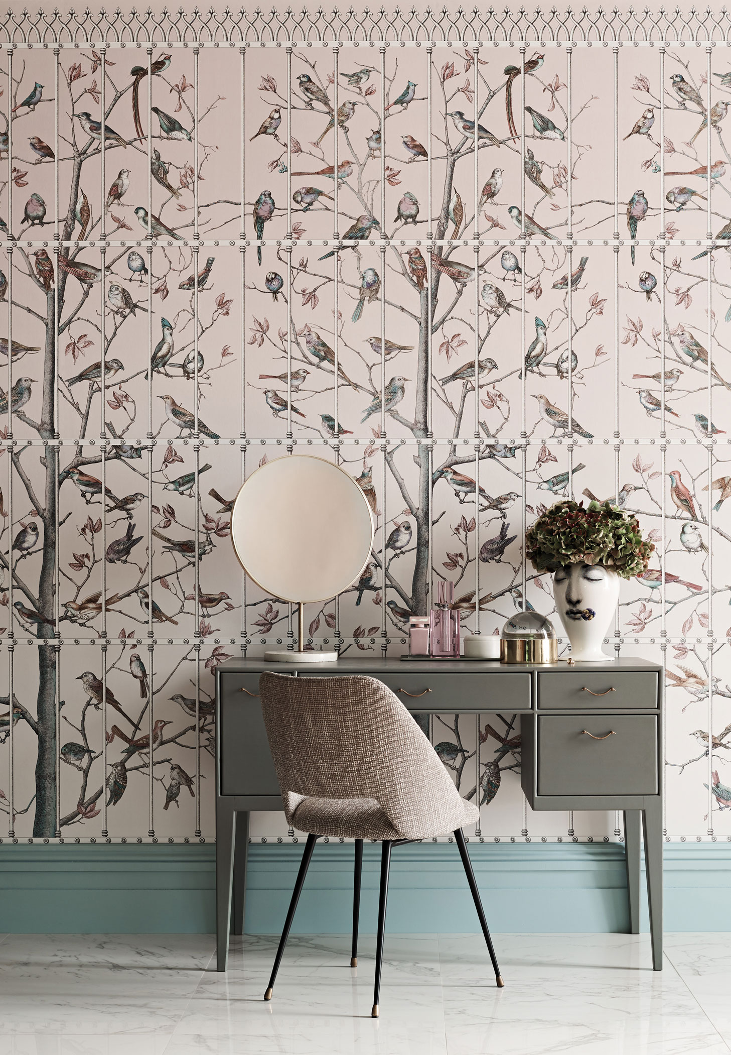 Ursprünglich als spanische Wand geschaffen wurde die Tapete Uccelli zuerst als eine Wandbekleidung für ein Luxushotel auf der Argentario-Halbinsel in der Toskana entworfen.