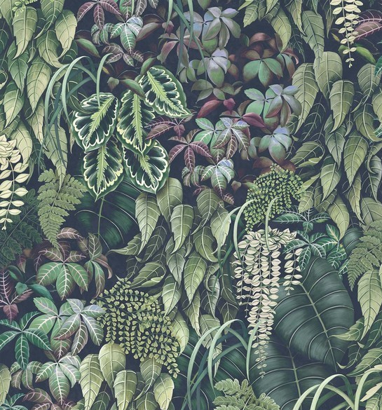 Die Tapete Green Wall des Herstellers Osborne und Little zeigt den aktuellen Trend für urbane Dschungelmotive im städtischen Kontext. Die Töne von überwiegend dunkelgrünem Laub stehen im Kontrast zu rot sowie lila Blättern oder viel blasseren grünen Zweigen.