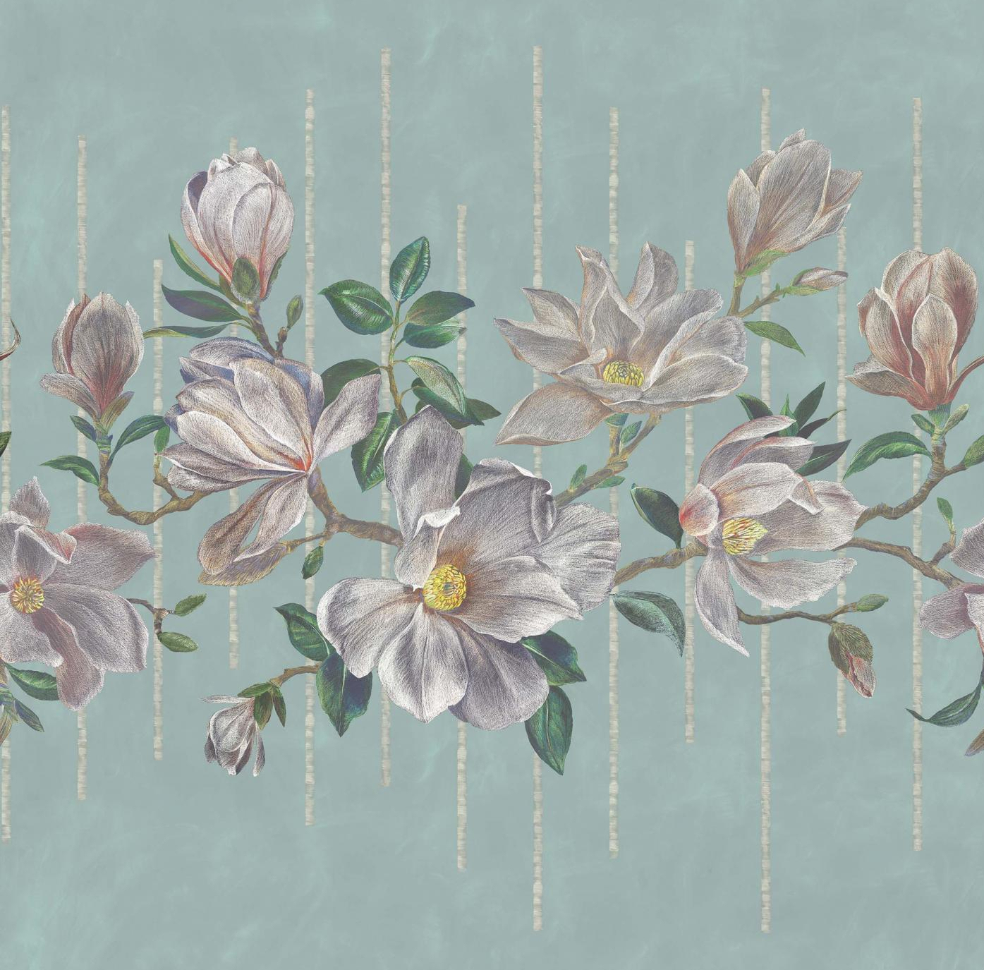 Dieses Tapetenmotiv ist an jeder Wand ein echter Hingucker. Abgebildet sind schlanke Bambusstangen mit blühenden Magnolien. Die Blüten sind wahlweise auf auf malerischem Untergrund in Aqua oder Anthrazit abgebildet. Jede Tapetenrolle besteht aus drei aneinander liegenden Paneelen.