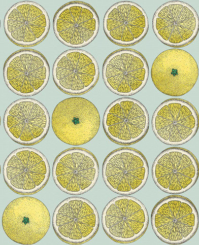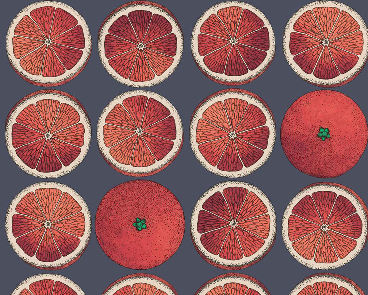 Das Tapetenmotiv zeigt aufgeschnittene Zitrusfrüchte auf einem poppigen Hintgergrund und verwandelt damit jeden Küchen- oder Essbereich zu einem echten Hingucker.