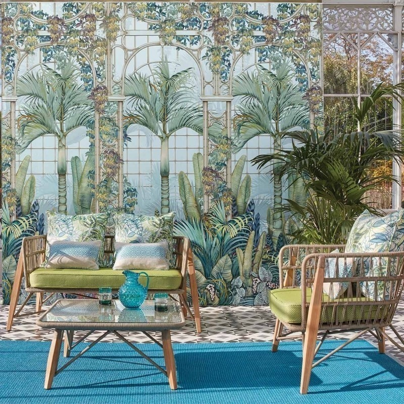 Das Dessin zeigt die detailreiche Architektur eines tropischen Hauses und die Vielfalt der darin untergebrachten Pflanzen vor wahlweise zwei verschiedenen Hintergründen.