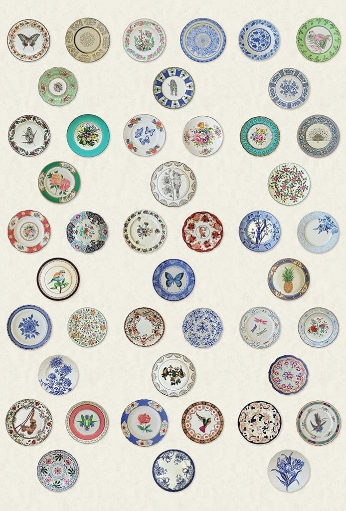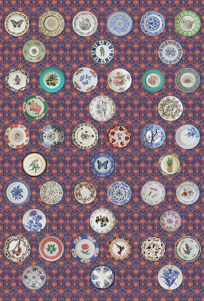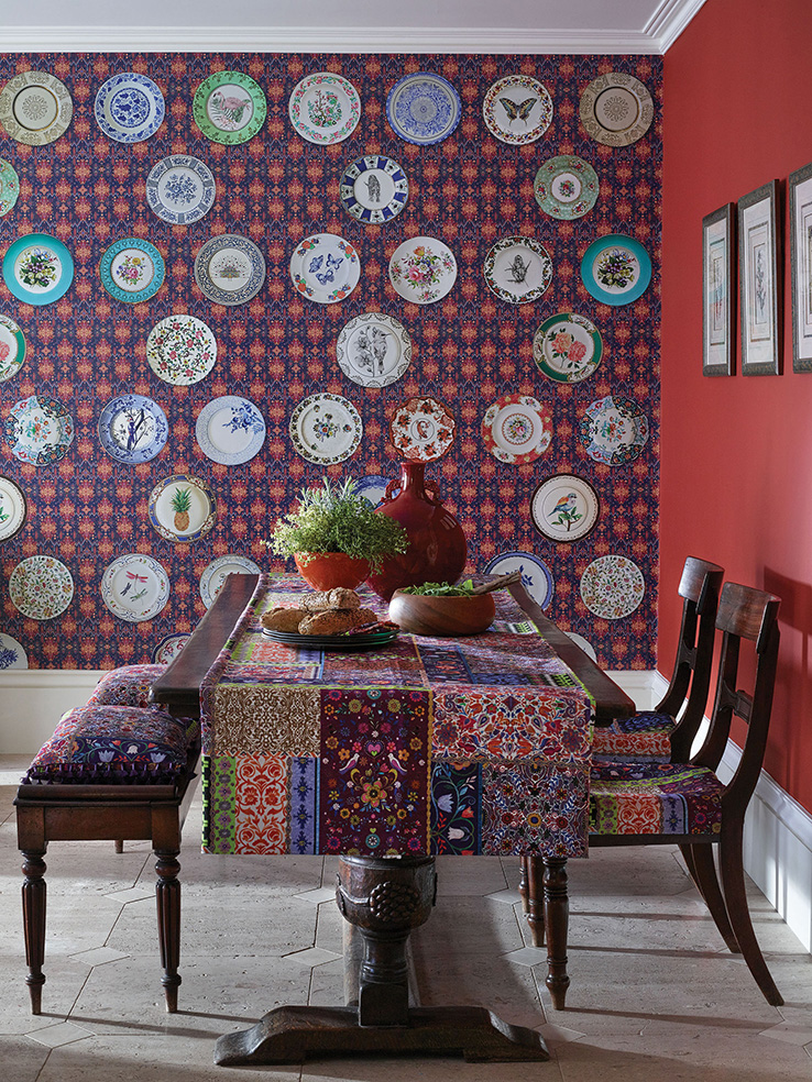 Die Tapete Ceramica zeigt wunderschön illustrierte Porzellanteller, die auf einem gemusterten Hintergrund angeordnet sind und an einen farbenfrohen Kelim erinnert.
