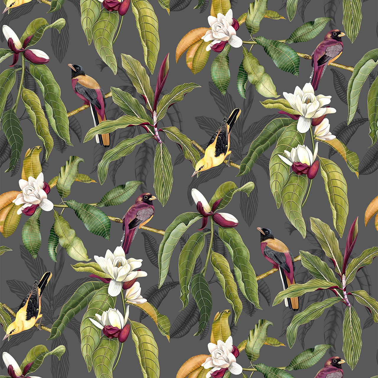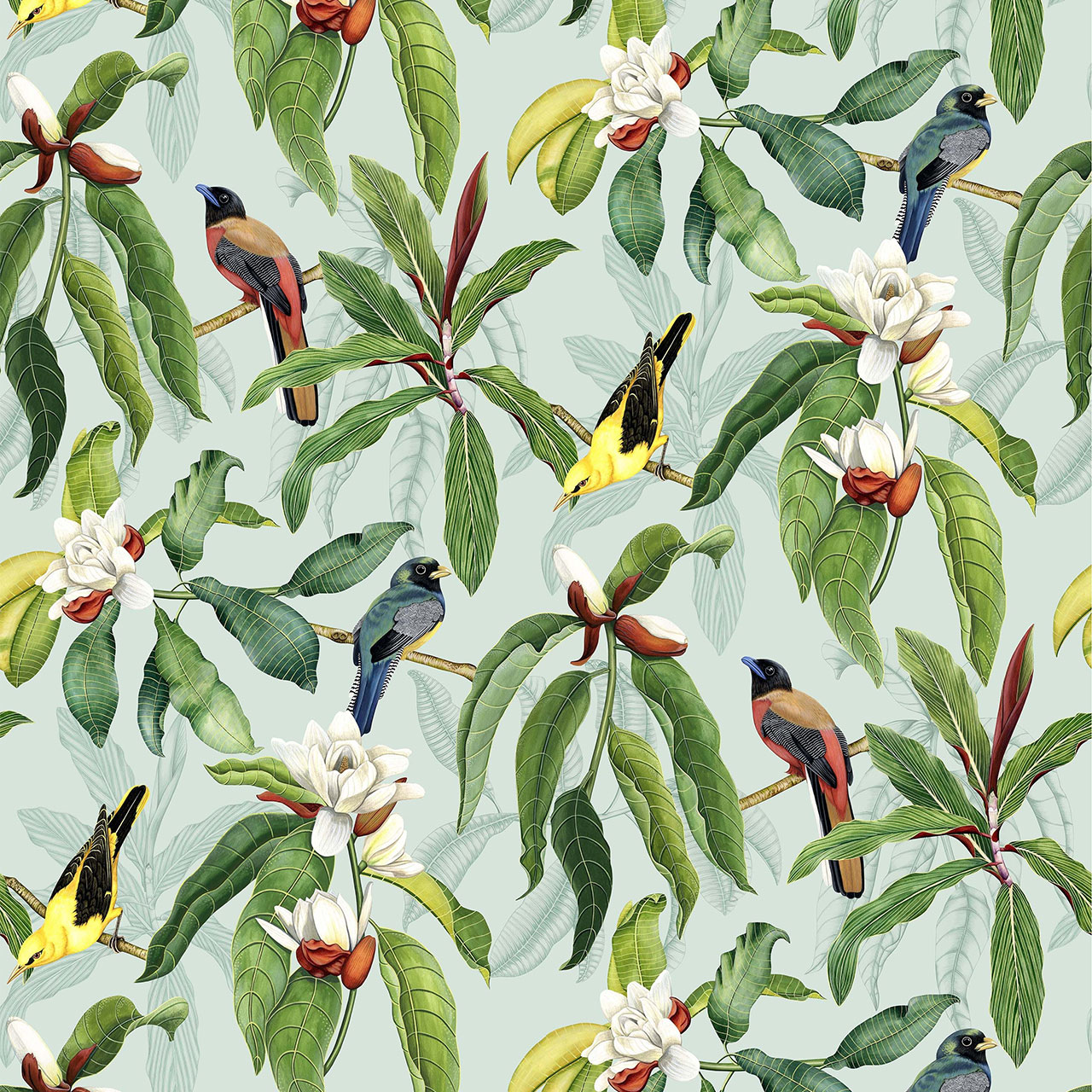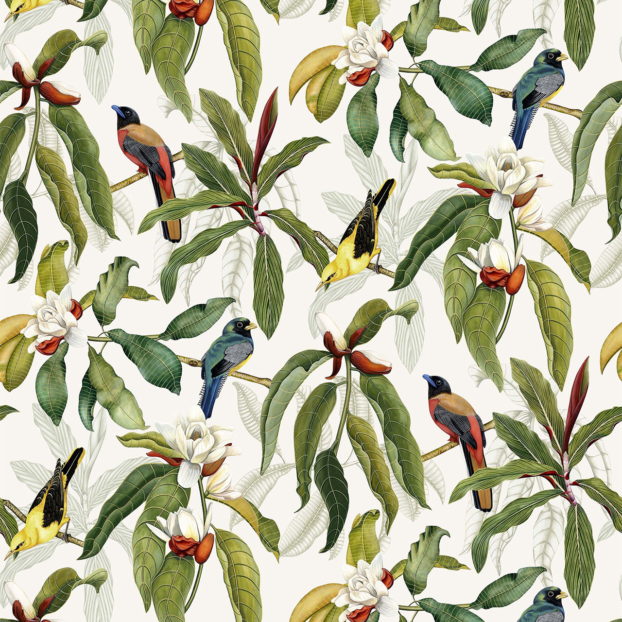 Das fröhliche Tapetenmotiv zeigt exotische Vögel, die in Ästen eines Magnolienbaums mit knospenden Blüten sitzen.