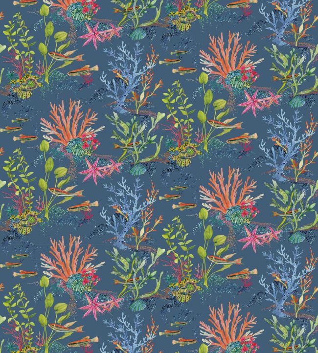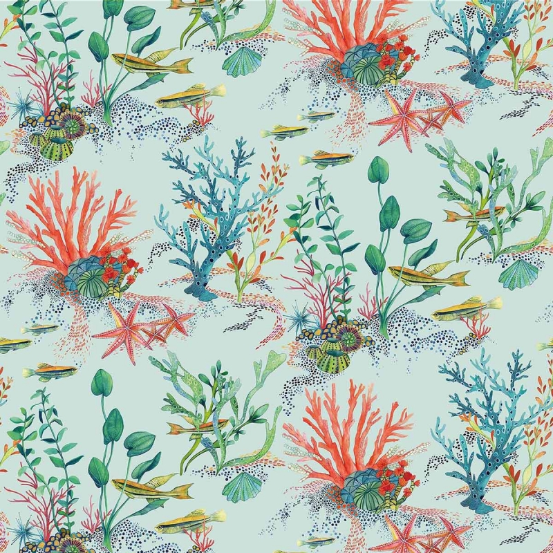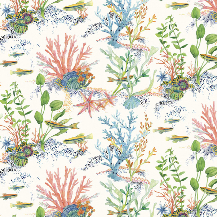 Die zeitlose Tapete Coralline zeigt eine Unterwasserszene aus Korallen, Algen, Seeanemonen, Seesternen, Muscheln und Fischschwärmen.